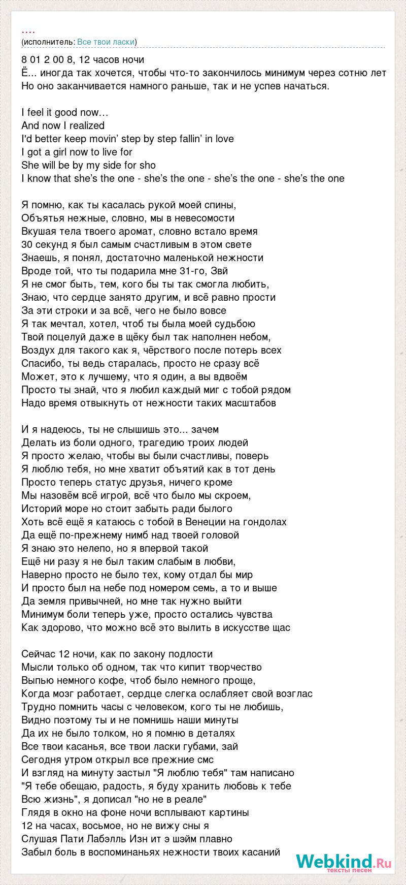 8 01 2 00 8, 12 часов ночи Ё... иногда так хочется, чтобы что-то закончилось минимум через сотню лет Но оно заканчивается намного раньше, так и не успев начаться. I feel it good now… And now I realized I'd better keep movin’ step by step fallin’ in love I got a girl now to live for She will be by my side for sho I know that she’s the one - she’s the one - she’s the one - she’s the one Я помню, как ты касалась рукой моей спины, Объятья нежные, словно, мы в невесомости Вкушая тела твоего аромат, словно встало время 30 секунд я был самым счастливым в этом свете Знаешь, я понял, достаточно маленькой нежности Вроде той, что ты подарила мне 31-го, Звй Я не смог быть, тем, кого бы ты так смогла любить, Знаю, что сердце занято другим, и всё равно прости За эти строки и за всё, чего не было вовсе Я так мечтал, хотел, чтоб ты была моей судьбою Твой поцелуй даже в щёку был так наполнен небом, Воздух для такого как я, чёрствого после потерь всех Спасибо, ты ведь старалась, просто не сразу всё Может, это к лучшему, что я один, а вы вдвоём Просто ты знай, что я любил каждый миг с тобой рядом Надо время отвыкнуть от нежности таких масштабов И я надеюсь, ты не слышишь это... зачем Делать из боли одного, трагедию троих людей Я просто желаю, чтобы вы были счастливы, поверь Я люблю тебя, но мне хватит объятий как в тот день Просто теперь статус друзья, ничего кроме Мы назовём всё игрой, всё что было мы скроем, Историй море но стоит забыть ради былого Хоть всё ещё я катаюсь с тобой в Венеции на гондолах Да ещё по-прежнему нимб над твоей головой Я знаю это нелепо, но я впервой такой Ещё ни разу я не был таким слабым в любви, Наверно просто не было тех, кому отдал бы мир И просто был на небе под номером семь, а то и выше Да земля привычней, но мне так нужно выйти Минимум боли теперь уже, просто остались чувства Как здорово, что можно всё это вылить в искусстве щас Сейчас 12 ночи, как по закону подлости Мысли только об одном, так что кипит творчество Выпью немного кофе, чтоб было немного проще, Когда мозг работает, сердце слегка ослабляет свой возглас Трудно помнить часы с человеком, кого ты не любишь, Видно поэтому ты и не помнишь наши минуты Да их не было толком, но я помню в деталях Все твои касанья, все твои ласки губами, зай Сегодня утром открыл все прежние смс И взгляд на минуту застыл "Я люблю тебя" там написано "Я тебе обещаю, радость, я буду хранить любовь к тебе Всю жизнь", я дописал "но не в реале" Глядя в окно на фоне ночи всплывают картины 12 на часах, восьмое, но не вижу сны я Слушая Пати Лабэлль Изн ит э шэйм плавно Забыл боль в воспоминаньях нежности твоих касаний