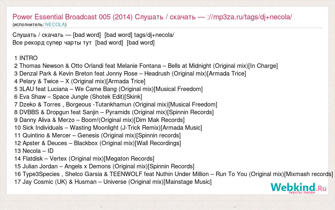 Слушать / скачать — [bad word] [bad word] tags/dj+necola/ Все рекорд супер чарты тут [bad word] [bad word] 1 INTRO 2 Thomas Newson & Otto Orlandi feat Melanie Fontana – Bells at Midnight (Original mix)[In Charge] 3 Denzal Park & Kevin Breton feat Jonny Rose – Headrush (Original mix)[Armada Trice] 4 Pelary & Twice – X (Original mix)[Armada Trice] 5 3LAU feat Luciana – We Came Bang (Original mix)[Musical Freedom] 6 Eva Shaw – Space Jungle (Shotek Edit)[Skink] 7 Dzeko & Torres , Borgeous -Tutankhamun (Original mix)[Musical Freedom] 8 DVBBS & Dropgun feat Sanjin – Pyramids (Original mix)[Spinnin Records] 9 Danny Aliva & Merzo – Boom!(Original mix)[Dim Mak Records] 10 Sick Individuals – Wasting Moonlight (J-Trick Remix)[Armada Music] 11 Quintino & Mercer – Genesis (Original mix)[Spinnin records] 12 Apster & Deuces – Blackbox (Original mix)[Wall Recordings] 13 Necola – ID 14 Flatdisk – Vertex (Original mix)[Megaton Records] 15 Julian Jordan – Angels x Demons (Original mix)[Spinnin Records] 16 Type3Species , Shelco Garsia & TEENWOLF feat Nuthin Under Million – Run To You (Original mix)[Mixmash records] 17 Jay Cosmic (UK) & Husman – Universe (Original mix)[Mainstage Music]
