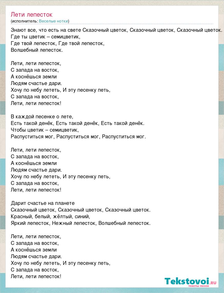 Знают все, что есть на свете Сказочный цветок, Сказочный цветок, Сказочный цветок. Где ты цветик – семицветик, Где твой лепесток, Где твой лепесток, Волшебный лепесток. Лети, лети лепесток, С запада на восток, А коснёшься земли Людям счастье дари. Хочу по небу лететь, И эту песенку петь, С запада на восток, Лети, лети лепесток! В каждой песенке о лете, Есть такой денёк, Есть такой денёк, Есть такой денёк. Чтобы цветик – семицветик, Распуститься мог, Распуститься мог, Распуститься мог. Лети, лети лепесток, С запада на восток, А коснёшься земли Людям счастье дари. Хочу по небу лететь, И эту песенку петь, С запада на восток, Лети, лети лепесток! Дарит счастье на планете Сказочный цветок, Сказочный цветок, Сказочный цветок. Красный, белый, жёлтый, синий, Яркий лепесток, Нежный лепесток, Волшебный лепесток. Лети, лети лепесток, С запада на восток, А коснёшься земли Людям счастье дари. Хочу по небу лететь, И эту песенку петь, С запада на восток, Лети, лети лепесток!