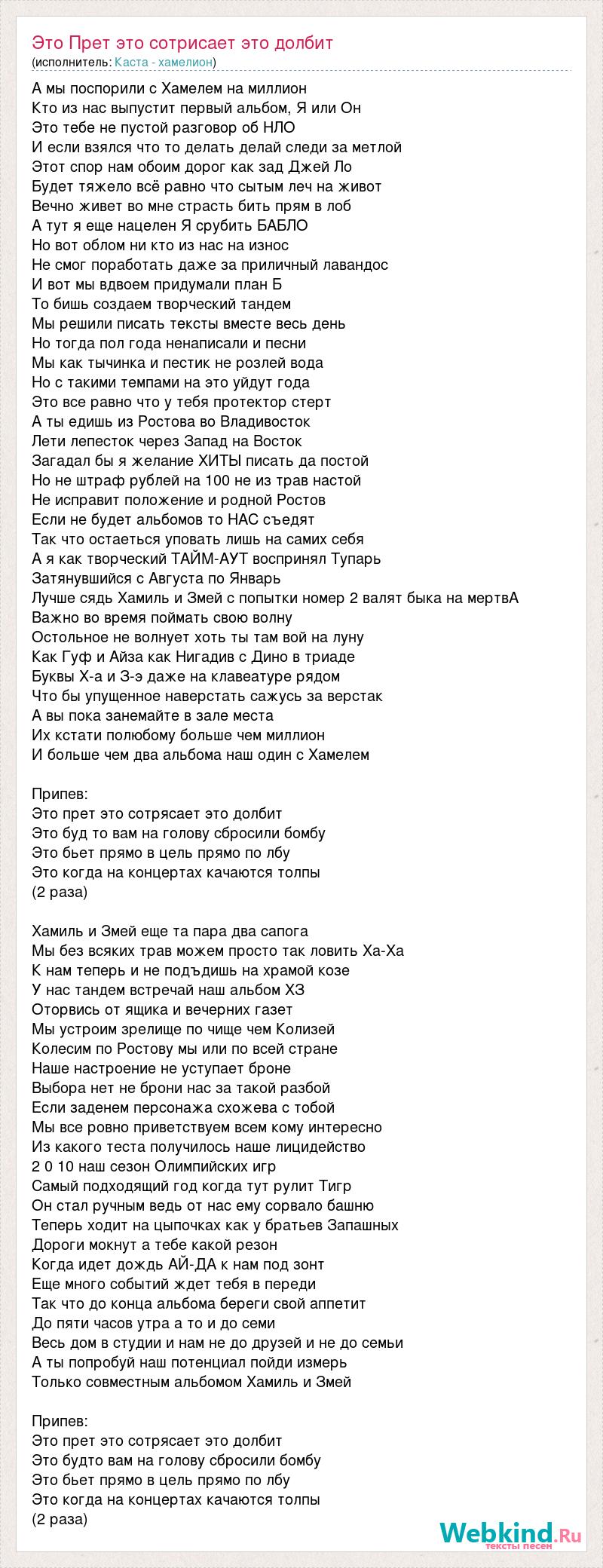 А мы поспорили с Хамелем на миллион Кто из нас выпустит первый альбом, Я или Он Это тебе не пустой разговор об НЛО И если взялся что то делать делай следи за метлой Этот спор нам обоим дорог как зад Джей Ло Будет тяжело всё равно что сытым леч на живот Вечно живет во мне страсть бить прям в лоб А тут я еще нацелен Я срубить БАБЛО Но вот облом ни кто из нас на износ Не смог поработать даже за приличный лавандос И вот мы вдвоем придумали план Б То бишь создаем творческий тандем Мы решили писать тексты вместе весь день Но тогда пол года ненаписали и песни Мы как тычинка и пестик не розлей вода Но с такими темпами на это уйдут года Это все равно что у тебя протектор стерт А ты едишь из Ростова во Владивосток Лети лепесток через Запад на Восток Загадал бы я желание ХИТЫ писать да постой Но не штраф рублей на 100 не из трав настой Не исправит положение и родной Ростов Если не будет альбомов то НАС съедят Так что остаеться уповать лишь на самих себя А я как творческий ТАЙМ-АУТ воспринял Тупарь Затянувшийся с Августа по Январь Лучше сядь Хамиль и Змей с попытки номер 2 валят быка на мертвА Важно во время поймать свою волну Остольное не волнует хоть ты там вой на луну Как Гуф и Айза как Нигадив с Дино в триаде Буквы Х-а и З-э даже на клавеатуре рядом Что бы упущенное наверстать сажусь за верстак А вы пока занемайте в зале места Их кстати полюбому больше чем миллион И больше чем два альбома наш один с Хамелем Припев: Это прет это сотрясает это долбит Это буд то вам на голову сбросили бомбу Это бьет прямо в цель прямо по лбу Это когда на концертах качаются толпы (2 раза) Хамиль и Змей еще та пара два сапога Мы без всяких трав можем просто так ловить Ха-Ха К нам теперь и не подъдишь на храмой козе У нас тандем встречай наш альбом ХЗ Оторвись от ящика и вечерних газет Мы устроим зрелище по чище чем Колизей Колесим по Ростову мы или по всей стране Наше настроение не уступает броне Выбора нет не брони нас за такой разбой Если заденем персонажа схожева с тобой Мы все ровно приветствуем всем кому интересно Из какого теста получилось наше лицидейство 2 0 10 наш сезон Олимпийских игр Самый подходящий год когда тут рулит Тигр Он стал ручным ведь от нас ему сорвало башню Теперь ходит на цыпочках как у братьев Запашных Дороги мокнут а тебе какой резон Когда идет дождь АЙ-ДА к нам под зонт Еще много событий ждет тебя в переди Так что до конца альбома береги свой аппетит До пяти часов утра а то и до семи Весь дом в студии и нам не до друзей и не до семьи А ты попробуй наш потенциал пойди измерь Только совместным альбомом Хамиль и Змей Припев: Это прет это сотрясает это долбит Это будто вам на голову сбросили бомбу Это бьет прямо в цель прямо по лбу Это когда на концертах качаются толпы (2 раза)