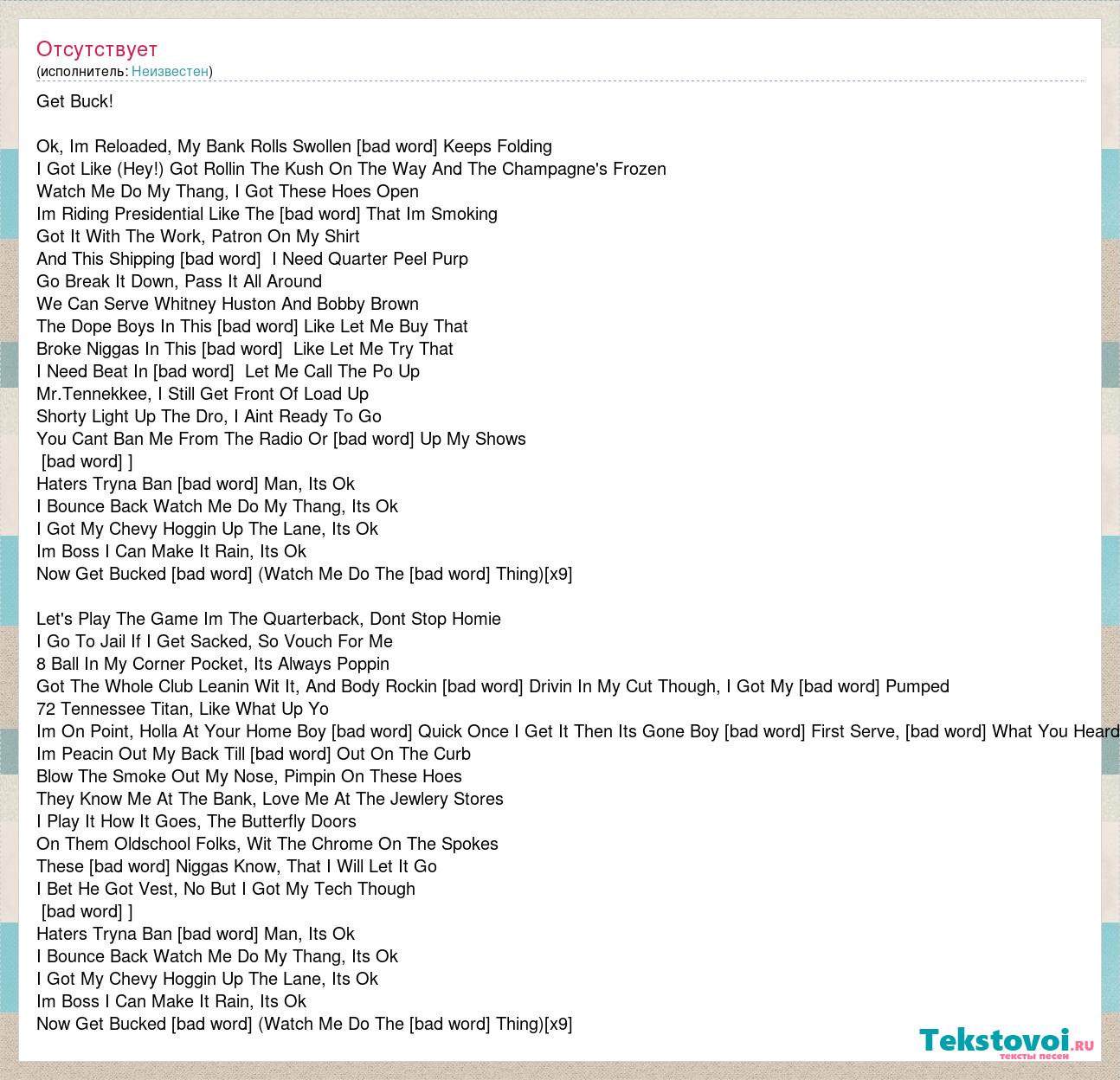 Get Buck! Ok, Im Reloaded, My Bank Rolls Swollen [bad word] Keeps Folding I Got Like (Hey!) Got Rollin The Kush On The Way And The Champagne's Frozen Watch Me Do My Thang, I Got These Hoes Open Im Riding Presidential Like The [bad word] That Im Smoking Got It With The Work, Patron On My Shirt And This Shipping [bad word] I Need Quarter Peel Purp Go Break It Down, Pass It All Around We Can Serve Whitney Huston And Bobby Brown The Dope Boys In This [bad word] Like Let Me Buy That Broke Niggas In This [bad word] Like Let Me Try That I Need Beat In [bad word] Let Me Call The Po Up Mr.Tennekkee, I Still Get Front Of Load Up Shorty Light Up The Dro, I Aint Ready To Go You Cant Ban Me From The Radio Or [bad word] Up My Shows [Chorus:] Haters Tryna Ban [bad word] Man, Its Ok I Bounce Back Watch Me Do My Thang, Its Ok I Got My Chevy Hoggin Up The Lane, Its Ok Im Boss I Can Make It Rain, Its Ok Now Get Bucked [bad word] (Watch Me Do The [bad word] Thing)[x9] Let's Play The Game Im The Quarterback, Dont Stop Homie I Go To Jail If I Get Sacked, So Vouch For Me 8 Ball In My Corner Pocket, Its Always Poppin Got The Whole Club Leanin Wit It, And Body Rockin Drunk Drivin In My Cut Though, I Got My Trunk Pumped 72 Tennessee Titan, Like What Up Yo Im On Point, Holla At Your Home Boy Better Come Quick Once I Get It Then Its Gone Boy First Come First Serve, [bad word] What You Heard Im Peacin Out My Back Till I Come Out On The Curb Blow The Smoke Out My Nose, Pimpin On These Hoes They Know Me At The Bank, Love Me At The Jewlery Stores I Play It How It Goes, The Butterfly Doors On Them Oldschool Folks, Wit The Chrome On The Spokes These [bad word] Niggas Know, That I Will Let It Go I Bet He Got Vest, No But I Got My Tech Though [Chorus:] Haters Tryna Ban [bad word] Man, Its Ok I Bounce Back Watch Me Do My Thang, Its Ok I Got My Chevy Hoggin Up The Lane, Its Ok Im Boss I Can Make It Rain, Its Ok Now Get Bucked [bad word] (Watch Me Do The [bad word] Thing)[x9]