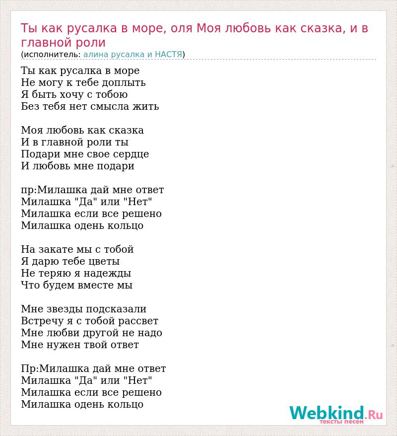 Ты как русалка в море Не могу к тебе доплыть Я быть хочу с тобою Без тебя нет смысла жить Моя любовь как сказка И в главной роли ты Подари мне свое сердце И любовь мне подари пр:Милашка дай мне ответ Милашка "Да" или "Нет" Милашка если все решено Милашка одень кольцо На закате мы с тобой Я дарю тебе цветы Не теряю я надежды Что будем вместе мы Мне звезды подсказали Встречу я с тобой рассвет Мне любви другой не надо Мне нужен твой ответ Пр:Милашка дай мне ответ Милашка "Да" или "Нет" Милашка если все решено Милашка одень кольцо
