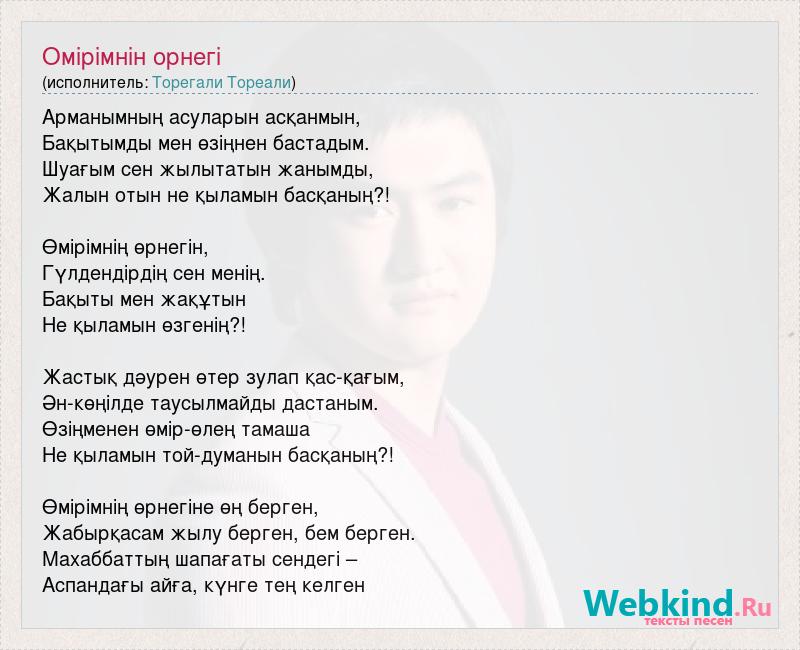 Арманымның асуларын асқанмын, Бақытымды мен өзіңнен бастадым. Шуағым сен жылытатын жанымды, Жалын отын не қыламын басқаның?! Өмірімнің өрнегін, Гүлдендірдің сен менің. Бақыты мен жақұтын Не қыламын өзгенің?! Жастық дәурен өтер зулап қас-қағым, Ән-көңілде таусылмайды дастаным. Өзіңменен өмір-өлең тамаша Не қыламын той-думанын басқаның?! Өмірімнің өрнегіне өң берген, Жабырқасам жылу берген, бем берген. Махаббаттың шапағаты сендегі – Аспандағы айға, күнге тең келген