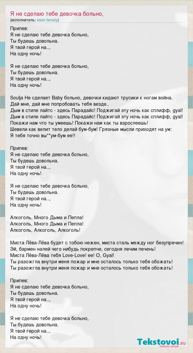 Припев: Я не сделаю тебе девочка больно, Ты будешь довольна. Я твой герой на.., На одну ночь! Я не сделаю тебе девочка больно, Ты будешь довольна. Я твой герой на.., На одну ночь! Soulja Не сделает Baby больно, девочки кидают трусики к ногам война. Дай мне, дай мне попробовать тебя везде.. Дым в стиле лайтс - здесь Парадайс! Поджигай эту ночь как сплифф, gyal! Дым в стиле лайтс - здесь Парадайс! Поджигай эту ночь как сплифф, gyal! Покажи нам что ты умеешь! Покажи нам как ты взрослеешь! Шевели как велит тело делай бум-бум! Грязные мысли приходят на ум: Я тебя точно вы**ум-бум ее!! Припев: Я не сделаю тебе девочка больно, Ты будешь довольна. Я твой герой на.., На одну ночь! Я не сделаю тебе девочка больно, Ты будешь довольна. Я твой герой на.., На одну ночь! Алкоголь, Много Дыма и Пепла! Алкоголь, Много Дыма и Пепла! Алкоголь, Алкоголь, Алкоголь! Миста Лёва-Лёва будет с тобою нежен, миста сталь между ног безупречен! Эй, бармен налей чего нибудь покрепче, сегодня лечим печень! Миста Лёва-Лёва тебя Love-Love! ее! O, Gyal! Ты разожгла внутри меня пожар и мне осталось только тебя обожать! Ты разожгла внутри меня пожар и мне осталось только тебя обожать! Припев: Я не сделаю тебе девочка больно, Ты будешь довольна. Я твой герой на.., На одну ночь! Я не сделаю тебе девочка больно, Ты будешь довольна. Я твой герой на.., На одну ночь!