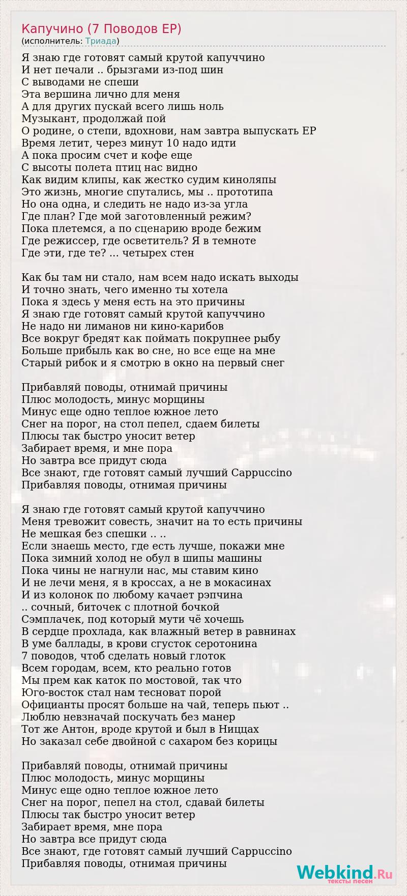 Я знаю где готовят самый крутой капуччино И нет печали .. брызгами из-под шин С выводами не спеши Эта вершина лично для меня А для других пускай всего лишь ноль Музыкант, продолжай пой О родине, о степи, вдохнови, нам завтра выпускать EP Время летит, через минут 10 надо идти А пока просим счет и кофе еще С высоты полета птиц нас видно Как видим клипы, как жестко судим киноляпы Это жизнь, многие спутались, мы .. прототипа Но она одна, и следить не надо из-за угла Где план? Где мой заготовленный режим? Пока плетемся, а по сценарию вроде бежим Где режиссер, где осветитель? Я в темноте Где эти, где те? ... четырех стен Как бы там ни стало, нам всем надо искать выходы И точно знать, чего именно ты хотела Пока я здесь у меня есть на это причины Я знаю где готовят самый крутой капуччино Не надо ни лиманов ни кино-карибов Все вокруг бредят как поймать покрупнее рыбу Больше прибыль как во сне, но все еще на мне Старый рибок и я смотрю в окно на первый снег Прибавляй поводы, отнимай причины Плюс молодость, минус морщины Минус еще одно теплое южное лето Снег на порог, на стол пепел, сдаем билеты Плюсы так быстро уносит ветер Забирает время, и мне пора Но завтра все придут сюда Все знают, где готовят самый лучший Сappuccino Прибавляя поводы, отнимая причины Я знаю где готовят самый крутой капуччино Меня тревожит совесть, значит на то есть причины Не мешкая без спешки .. .. Если знаешь место, где есть лучше, покажи мне Пока зимний холод не обул в шипы машины Пока чины не нагнули нас, мы ставим кино И не лечи меня, я в кроссах, а не в мокасинах И из колонок по любому качает рэпчина .. сочный, биточек с плотной бочкой Сэмплачек, под который мути чё хочешь В сердце прохлада, как влажный ветер в равнинах В уме баллады, в крови сгусток серотонина 7 поводов, чтоб сделать новый глоток Всем городам, всем, кто реально готов Мы прем как каток по мостовой, так что Юго-восток стал нам тесноват порой Официанты просят больше на чай, теперь пьют .. Люблю невзначай поскучать без манер Тот же Антон, вроде крутой и был в Ниццах Но заказал себе двойной с сахаром без корицы Прибавляй поводы, отнимай причины Плюс молодость, минус морщины Минус еще одно теплое южное лето Снег на порог, пепел на стол, сдавай билеты Плюсы так быстро уносит ветер Забирает время, мне пора Но завтра все придут сюда Все знают, где готовят самый лучший Сappuccino Прибавляя поводы, отнимая причины