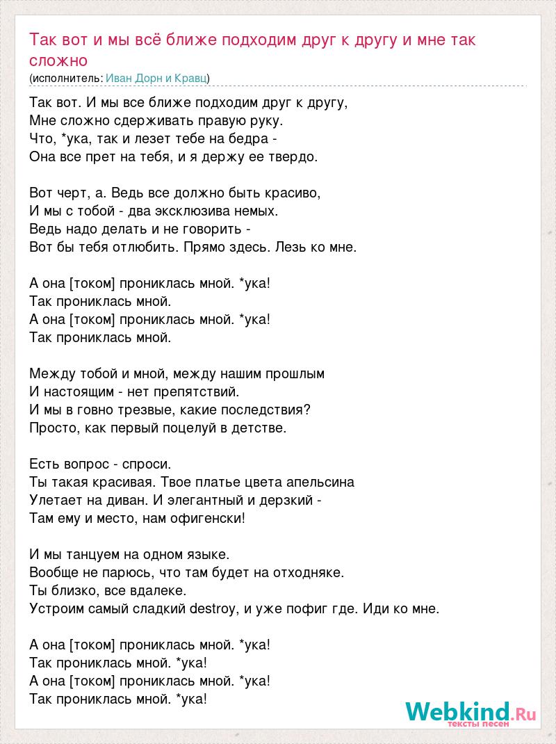 Так вот. И мы все ближе подходим друг к другу, Мне сложно сдерживать правую руку. Что, *ука, так и лезет тебе на бедра - Она все прет на тебя, и я держу ее твердо. Вот черт, а. Ведь все должно быть красиво, И мы с тобой - два эксклюзива немых. Ведь надо делать и не говорить - Вот бы тебя отлюбить. Прямо здесь. Лезь ко мне. А она [током] прониклась мной. *ука! Так прониклась мной. А она [током] прониклась мной. *ука! Так прониклась мной. Между тобой и мной, между нашим прошлым И настоящим - нет препятствий. И мы в говно трезвые, какие последствия? Просто, как первый поцелуй в детстве. Есть вопрос - спроси. Ты такая красивая. Твое платье цвета апельсина Улетает на диван. И элегантный и дерзкий - Там ему и место, нам офигенски! И мы танцуем на одном языке. Вообще не парюсь, что там будет на отходняке. Ты близко, все вдалеке. Устроим самый сладкий destroy, и уже пофиг где. Иди ко мне. А она [током] прониклась мной. *ука! Так прониклась мной. *ука! А она [током] прониклась мной. *ука! Так прониклась мной. *ука!