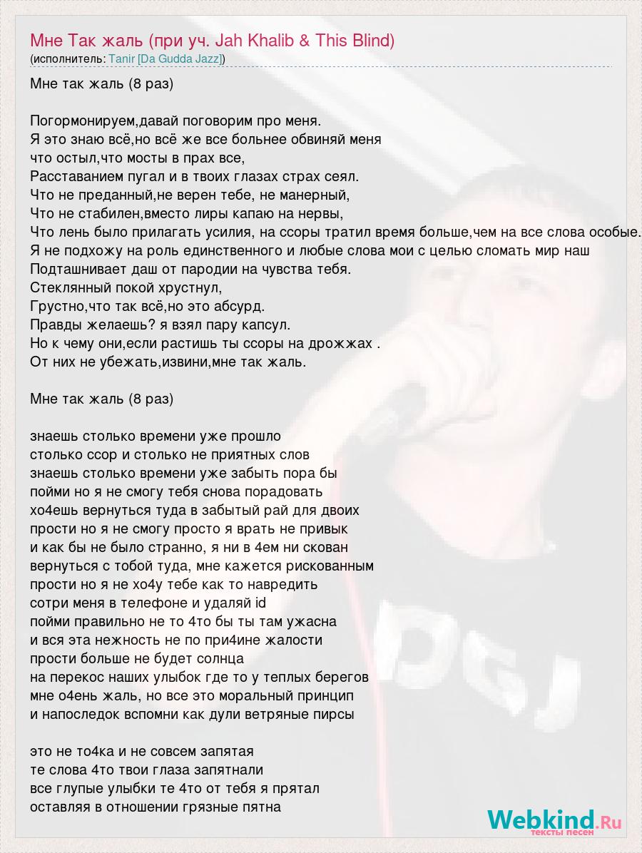 Мне так жаль (8 раз) Погормонируем,давай поговорим про меня. Я это знаю всё,но всё же все больнее обвиняй меня что остыл,что мосты в прах все, Расставанием пугал и в твоих глазах страх сеял. Что не преданный,не верен тебе, не манерный, Что не стабилен,вместо лиры капаю на нервы, Что лень было прилагать усилия, на ссоры тратил время больше,чем на все слова особые. Я не подхожу на роль единственного и любые слова мои с целью сломать мир наш Подташнивает даш от пародии на чувства тебя. Стеклянный покой хрустнул, Грустно,что так всё,но это абсурд. Правды желаешь? я взял пару капсул. Но к чему они,если растишь ты ссоры на дрожжах . От них не убежать,извини,мне так жаль. Мне так жаль (8 раз) знаешь столько времени уже прошло столько ссор и столько не приятных слов знаешь столько времени уже забыть пора бы пойми но я не смогу тебя снова порадовать хо4ешь вернуться туда в забытый рай для двоих прости но я не смогу просто я врать не привык и как бы не было странно, я ни в 4ем ни скован вернуться с тобой туда, мне кажется рискованным прости но я не хо4у тебе как то навредить сотри меня в телефоне и удаляй id пойми правильно не то 4то бы ты там ужасна и вся эта нежность не по при4ине жалости прости больше не будет солнца на перекос наших улыбок где то у теплых берегов мне о4ень жаль, но все это моральный принцип и напоследок вспомни как дули ветряные пирсы это не то4ка и не совсем запятая те слова 4то твои глаза запятнали все глупые улыбки те 4то от тебя я прятал оставляя в отношении грязные пятна