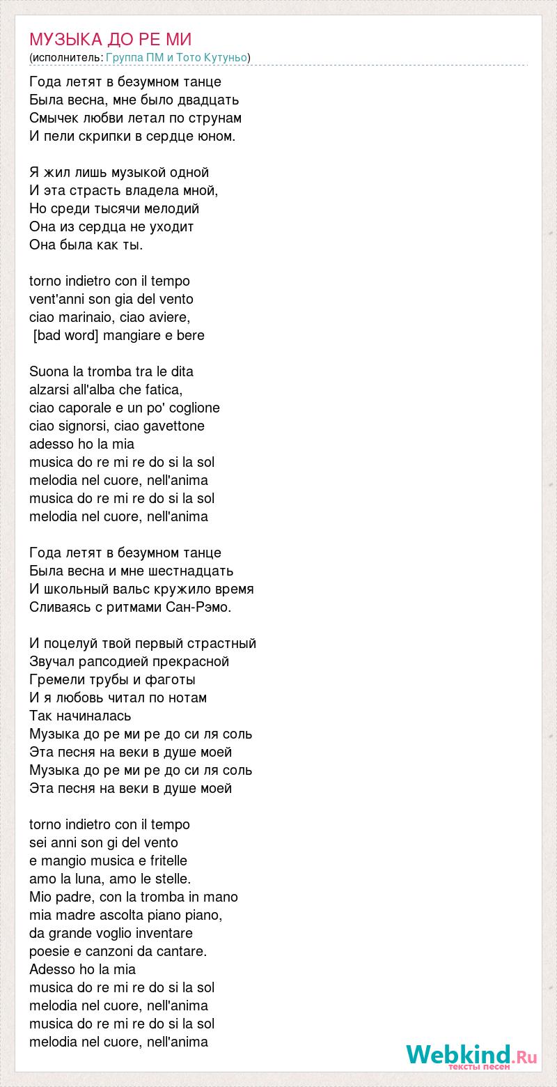 Года летят в безумном танце Была весна, мне было двадцать Смычек любви летал по струнам И пели скрипки в сердце юном. Я жил лишь музыкой одной И эта страсть владела мной, Но среди тысячи мелодий Она из сердца не уходит Она была как ты. torno indietro con il tempo vent'anni son gia del vento ciao marinaio, ciao aviere, [bad word] mangiare e bere Suona la tromba tra le dita alzarsi all'alba che fatica, ciao caporale e un po' coglione ciao signorsi, ciao gavettone adesso ho la mia musica do re mi re do si la sol melodia nel cuore, nell'anima musica do re mi re do si la sol melodia nel cuore, nell'anima Года летят в безумном танце Была весна и мне шестнадцать И школьный вальс кружило время Сливаясь с ритмами Сан-Рэмо. И поцелуй твой первый страстный Звучал рапсодией прекрасной Гремели трубы и фаготы И я любовь читал по нотам Так начиналась Музыка до ре ми ре до си ля соль Эта песня на веки в душе моей Музыка до ре ми ре до си ля соль Эта песня на веки в душе моей torno indietro con il tempo sei anni son gi del vento e mangio musica e fritelle amo la luna, amo le stelle. Mio padre, con la tromba in mano mia madre ascolta piano piano, da grande voglio inventare poesie e canzoni da cantare. Adesso ho la mia musica do re mi re do si la sol melodia nel cuore, nell'anima musica do re mi re do si la sol melodia nel cuore, nell'anima