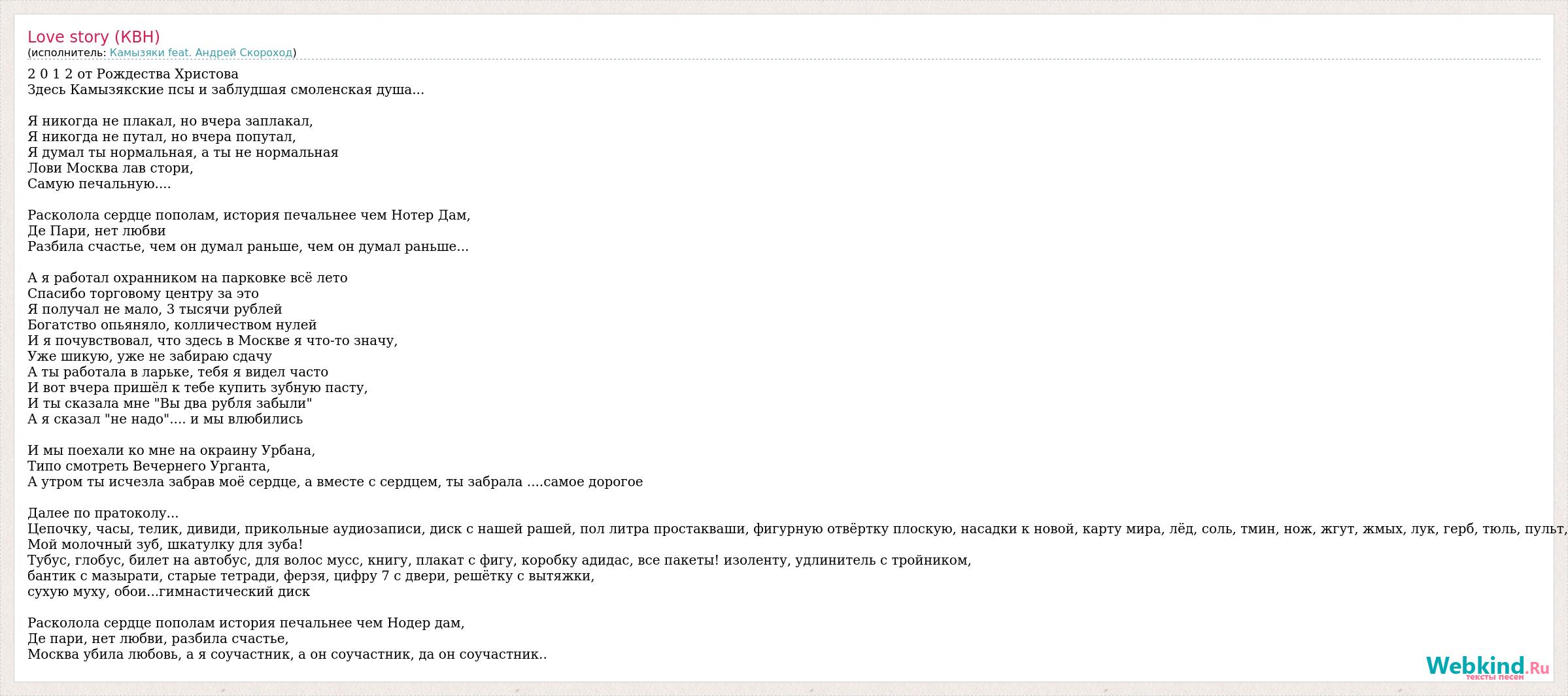 2 0 1 2 от Рождества Христова Здесь Камызякские псы и заблудшая смоленская душа... Я никогда не плакал, но вчера заплакал, Я никогда не путал, но вчера попутал, Я думал ты нормальная, а ты не нормальная Лови Москва лав стори, Самую печальную.... Расколола сердце пополам, история печальнее чем Нотер Дам, Де Пари, нет любви Разбила счастье, чем он думал раньше, чем он думал раньше... А я работал охранником на парковке всё лето Спасибо торговому центру за это Я получал не мало, 3 тысячи рублей Богатство опьяняло, колличеством нулей И я почувствовал, что здесь в Москве я что-то значу, Уже шикую, уже не забираю сдачу А ты работала в ларьке, тебя я видел часто И вот вчера пришёл к тебе купить зубную пасту, И ты сказала мне "Вы два рубля забыли" А я сказал "не надо".... и мы влюбились И мы поехали ко мне на окраину Урбана, Типо смотреть Вечернего Урганта, А утром ты исчезла забрав моё сердце, а вместе с сердцем, ты забрала ....самое дорогое Далее по пратоколу... Цепочку, часы, телик, дивиди, прикольные аудиозаписи, диск с нашей рашей, пол литра простакваши, фигурную отвёртку плоскую, насадки к новой, карту мира, лёд, соль, тмин, нож, жгут, жмых, лук, герб, тюль, пульт, Мой молочный зуб, шкатулку для зуба! Тубус, глобус, билет на автобус, для волос мусс, книгу, плакат с фигу, коробку адидас, все пакеты! изоленту, удлинитель с тройником, бантик с мазырати, старые тетради, ферзя, цифру 7 с двери, решётку с вытяжки, сухую муху, обои...гимнастический диск Расколола сердце пополам история печальнее чем Нодер дам, Де пари, нет любви, разбила счастье, Москва убила любовь, а я соучастник, а он соучастник, да он соучастник..