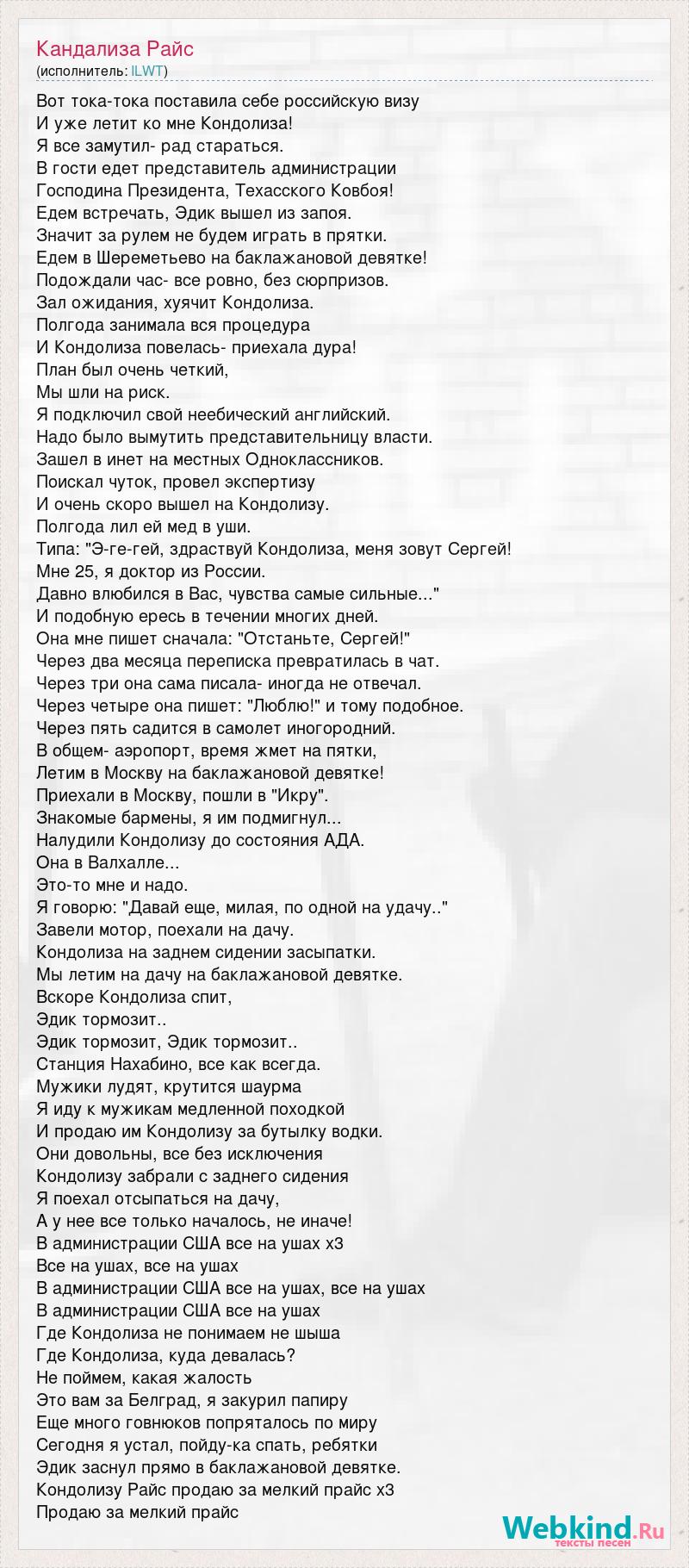 Вот тока-тока поставила себе российскую визу И уже летит ко мне Кондолиза! Я все замутил- рад стараться. В гости едет представитель администрации Господина Президента, Техасского Ковбоя! Едем встречать, Эдик вышел из запоя. Значит за рулем не будем играть в прятки. Едем в Шереметьево на баклажановой девятке! Подождали час- все ровно, без сюрпризов. Зал ожидания, хуячит Кондолиза. Полгода занимала вся процедура И Кондолиза повелась- приехала дура! План был очень четкий, Мы шли на риск. Я подключил свой неебический английский. Надо было вымутить представительницу власти. Зашел в инет на местных Одноклассников. Поискал чуток, провел экспертизу И очень скоро вышел на Кондолизу. Полгода лил ей мед в уши. Типа: "Э-ге-гей, здраствуй Кондолиза, меня зовут Сергей! Мне 25, я доктор из России. Давно влюбился в Вас, чувства самые сильные..." И подобную ересь в течении многих дней. Она мне пишет сначала: "Отстаньте, Сергей!" Через два месяца переписка превратилась в чат. Через три она сама писала- иногда не отвечал. Через четыре она пишет: "Люблю!" и тому подобное. Через пять садится в самолет иногородний. В общем- аэропорт, время жмет на пятки, Летим в Москву на баклажановой девятке! Приехали в Москву, пошли в "Икру". Знакомые бармены, я им подмигнул... Налудили Кондолизу до состояния АДА. Она в Валхалле... Это-то мне и надо. Я говорю: "Давай еще, милая, по одной на удачу.." Завели мотор, поехали на дачу. Кондолиза на заднем сидении засыпатки. Мы летим на дачу на баклажановой девятке. Вскоре Кондолиза спит, Эдик тормозит.. Эдик тормозит, Эдик тормозит.. Станция Нахабино, все как всегда. Мужики лудят, крутится шаурма Я иду к мужикам медленной походкой И продаю им Кондолизу за бутылку водки. Они довольны, все без исключения Кондолизу забрали с заднего сидения Я поехал отсыпаться на дачу, А у нее все только началось, не иначе! В администрации США все на ушах x3 Все на ушах, все на ушах В администрации США все на ушах, все на ушах В администрации США все на ушах Где Кондолиза не понимаем не шыша Где Кондолиза, куда девалась? Не поймем, какая жалость Это вам за Белград, я закурил папиру Еще много говнюков попряталось по миру Сегодня я устал, пойду-ка спать, ребятки Эдик заснул прямо в баклажановой девятке. Кондолизу Райс продаю за мелкий прайс x3 Продаю за мелкий прайс