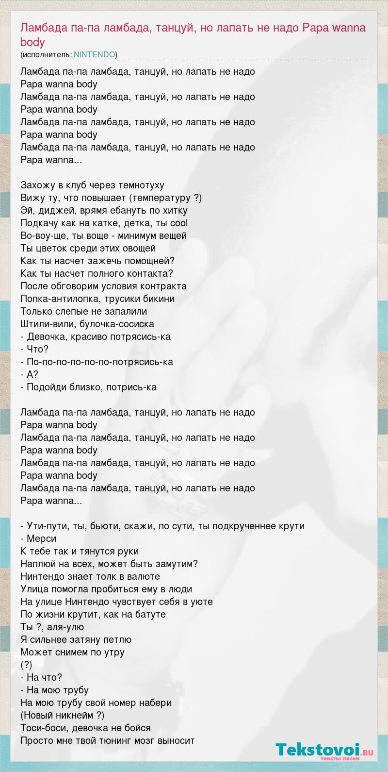 Ламбада па-па ламбада, танцуй, но лапать не надо Papa wanna body Ламбада па-па ламбада, танцуй, но лапать не надо Papa wanna body Ламбада па-па ламбада, танцуй, но лапать не надо Papa wanna body Ламбада па-па ламбада, танцуй, но лапать не надо Papa wanna... Захожу в клуб через темнотуху Вижу ту, что повышает (температуру ?) Эй, диджей, врямя ебануть по хитку Подкачу как на катке, детка, ты cool Во-воу-ще, ты воще - минимум вещей Ты цветок среди этих овощей Как ты насчет зажечь помощней? Как ты насчет полного контакта? После обговорим условия контракта Попка-антилопка, трусики бикини Только слепые не запалили Штили-вили, булочка-сосиска - Девочка, красиво потрясись-ка - Что? - По-по-по-по-по-по-потрясись-ка - А? - Подойди близко, потрись-ка Ламбада па-па ламбада, танцуй, но лапать не надо Papa wanna body Ламбада па-па ламбада, танцуй, но лапать не надо Papa wanna body Ламбада па-па ламбада, танцуй, но лапать не надо Papa wanna body Ламбада па-па ламбада, танцуй, но лапать не надо Papa wanna... - Ути-пути, ты, бьюти, скажи, по сути, ты подкрученнее крути - Мерси К тебе так и тянутся руки Наплюй на всех, может быть замутим? Нинтендо знает толк в валюте Улица помогла пробиться ему в люди На улице Нинтендо чувствует себя в уюте По жизни крутит, как на батуте Ты ?, аля-улю Я сильнее затяну петлю Может снимем по утру (?) - На что? - На мою трубу На мою трубу свой номер набери (Новый никнейм ?) Тоси-боси, девочка не бойся Просто мне твой тюнинг мозг выносит