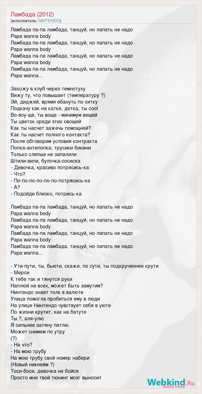 Ламбада па-па ламбада, танцуй, но лапать не надо Papa wanna body Ламбада па-па ламбада, танцуй, но лапать не надо Papa wanna body Ламбада па-па ламбада, танцуй, но лапать не надо Papa wanna body Ламбада па-па ламбада, танцуй, но лапать не надо Papa wanna... Захожу в клуб через темнотуху Вижу ту, что повышает (температуру ?) Эй, диджей, врямя ебануть по хитку Подкачу как на катке, детка, ты cool Во-воу-ще, ты воще - минимум вещей Ты цветок среди этих овощей Как ты насчет зажечь помощней? Как ты насчет полного контакта? После обговорим условия контракта Попка-антилопка, трусики бикини Только слепые не запалили Штили-вили, булочка-сосиска - Девочка, красиво потрясись-ка - Что? - По-по-по-по-по-по-потрясись-ка - А? - Подойди близко, потрись-ка Ламбада па-па ламбада, танцуй, но лапать не надо Papa wanna body Ламбада па-па ламбада, танцуй, но лапать не надо Papa wanna body Ламбада па-па ламбада, танцуй, но лапать не надо Papa wanna body Ламбада па-па ламбада, танцуй, но лапать не надо Papa wanna... - Ути-пути, ты, бьюти, скажи, по сути, ты подкрученнее крути - Мерси К тебе так и тянутся руки Наплюй на всех, может быть замутим? Нинтендо знает толк в валюте Улица помогла пробиться ему в люди На улице Нинтендо чувствует себя в уюте По жизни крутит, как на батуте Ты ?, аля-улю Я сильнее затяну петлю Может снимем по утру (?) - На что? - На мою трубу На мою трубу свой номер набери (Новый никнейм ?) Тоси-боси, девочка не бойся Просто мне твой тюнинг мозг выносит