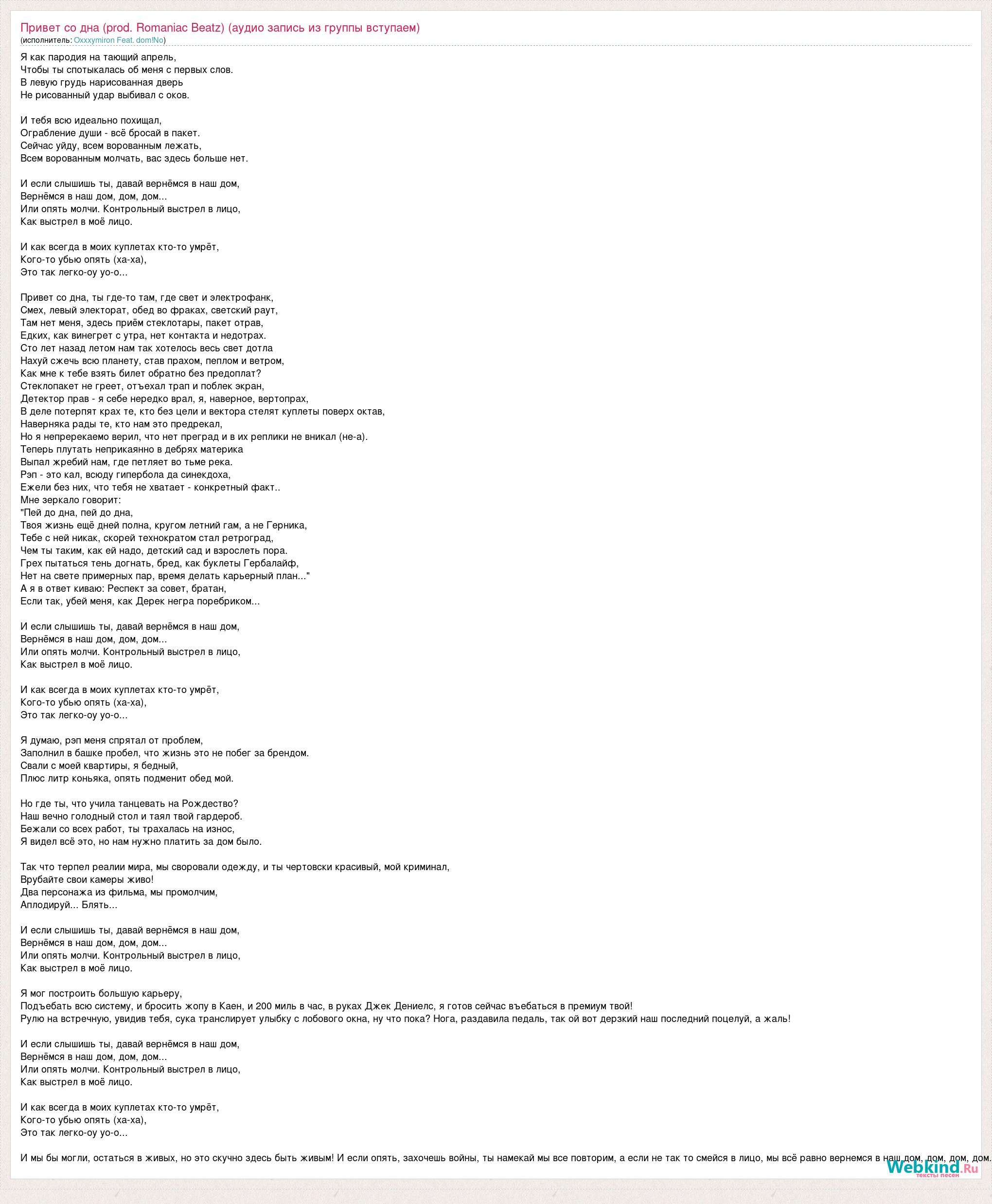 Главная→Исполнители→Oxxxymiron Feat. dom!No→Привет со дна (prod. Romaniac Beatz) (аудио запись из группы вступаем)