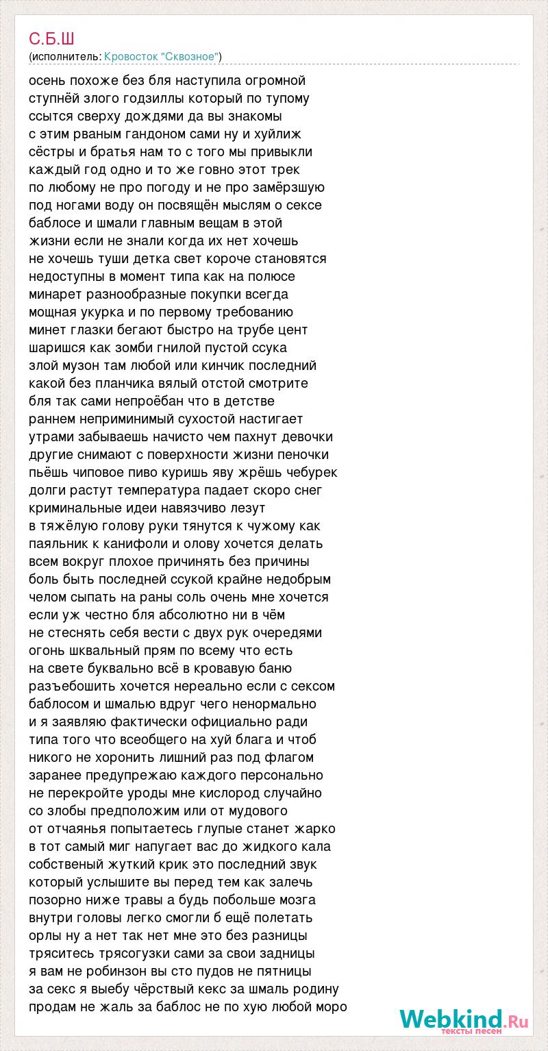осень похоже без бля наступила огромной ступнёй злого годзиллы который по тупому ссытся сверху дождями да вы знакомы с этим рваным гандоном сами ну и хуйлиж сёстры и братья нам то с того мы привыкли каждый год одно и то же говно этот трек по любому не про погоду и не про замёрзшую под ногами воду он посвящён мыслям о сексе баблосе и шмали главным вещам в этой жизни если не знали когда их нет хочешь не хочешь туши детка свет короче становятся недоступны в момент типа как на полюсе минарет разнообразные покупки всегда мощная укурка и по первому требованию минет глазки бегают быстро на трубе цент шаришся как зомби гнилой пустой ссука злой музон там любой или кинчик последний какой без планчика вялый отстой смотрите бля так сами непроёбан что в детстве раннем неприминимый сухостой настигает утрами забываешь начисто чем пахнут девочки другие снимают с поверхности жизни пеночки пьёшь чиповое пиво куришь яву жрёшь чебурек долги растут температура падает скоро снег криминальные идеи навязчиво лезут в тяжёлую голову руки тянутся к чужому как паяльник к канифоли и олову хочется делать всем вокруг плохое причинять без причины боль быть последней ссукой крайне недобрым челом сыпать на раны соль очень мне хочется если уж честно бля абсолютно ни в чём не стеснять себя вести с двух рук очередями огонь шквальный прям по всему что есть на свете буквально всё в кровавую баню разъебошить хочется нереально если с сексом баблосом и шмалью вдруг чего ненормально и я заявляю фактически официально ради типа того что всеобщего на хуй блага и чтоб никого не хоронить лишний раз под флагом заранее предупрежаю каждого персонально не перекройте уроды мне кислород случайно со злобы предположим или от мудового от отчаянья попытаетесь глупые станет жарко в тот самый миг напугает вас до жидкого кала собственый жуткий крик это последний звук который услышите вы перед тем как залечь позорно ниже травы а будь побольше мозга внутри головы легко смогли б ещё полетать орлы ну а нет так нет мне это без разницы тряситесь трясогузки сами за свои задницы я вам не робинзон вы сто пудов не пятницы за секс я выебу чёрствый кекс за шмаль родину продам не жаль за баблос не по хую любой моро