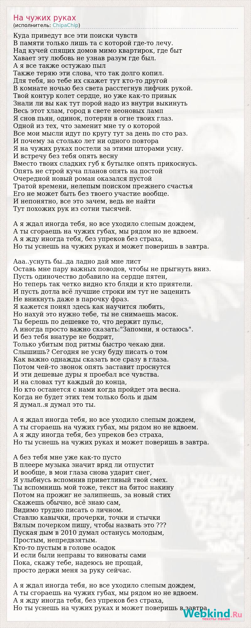 Куда приведут все эти поиски чувств В памяти только лишь та с которой где-то лечу. Над кучей спящих домов мимо квартирок, где быт Хавает эту любовь не узнав разум где был. А я все также остужаю пыл Также теряю эти слова, что так долго копил. Для тебя, но тебе их скажет тут кто-то другой В комнате ночью без света расстегнув лифчик рукой. Твой контур колет сердце, но уже как-то привык Знали ли вы как тут порой надо из внутри выкинуть Весь этот хлам, город в свете неоновых ламп Я снов пьян, одинок, потерян в огне твоих глаз. Одной из тех, что заменит мне ту о которой Все мои мысли идут по кругу тут за день по сто раз. И почему за столько лет ни одного повтора Я на чужих руках постели за этими шторами усну. И встречу без тебя опять весну Вместо твоих сладких губ к бутылке опять прикоснусь. Опять не строй куча планов опять на постой Очередной новый роман оказался пустой Тратой времени, нелепым поиском прежнего счастья Его не может быть без твоего участие вообще. И непонятно, все это зачем, ведь не найти Тут похожих рук из сотни тысячей. А я ждал иногда тебя, но все уходило слепым дождем, А ты сгораешь на чужих губах, мы рядом но не вдвоем. А я жду иногда тебя, без упреков без страха, Но ты уснешь на чужих руках и может поверишь в завтра. Ааа..уснуть бы..да ладно дай мне лист Оставь мне пару важных поводов, чтобы не прыгнуть вниз. Пусть одиночество добавило на сердце пятен, Но теперь так четко видно кто бляди и кто приятели. И пусть дотла всё лучшие строки им тут не заценить Не вникнуть даже в парочку фраз. Я кажется понял здесь как научится любить, Но нахуй это нужно тебе, ты не снимаешь масок. Ты берешь по дешевке то, что держит пульс, А иногда просто важно сказать:"Запомни, я остаюсь". И без тебя внатуре не бодрит, Только убитым под ритмы быстро чекаю дни. Слышишь? Сегодня не усну буду писать о том Как важно однажды сказать все сразу в глаза. Потом чей-то звонок опять заставит проснутся И эти дешевые дуры я проебал все чувства. И на словах тут каждый до конца, Но кто останется с нами когда пройдет эта весна. Когда не будет этих тем только боль и дым Я думал..я думал это ты. А я ждал иногда тебя, но все уходило слепым дождем, А ты сгораешь на чужих губах, мы рядом но не вдвоем. А я жду иногда тебя, без упреков без страха, Но ты уснешь на чужих руках и может поверишь в завтра. А без тебя мне уже как-то пусто В плеере музыка значит вряд ли отпустит И вообще, в мои глаза снова ударит снег, Я улыбнусь вспомнив приветливый твой смех. Ты вспомнишь мой тоже, текст на битос накину Потом на прожиг не залипнешь, за новый стих Скажешь обычно, всё знаю сам, Видимо трудно писать о личном. Ставлю кавычки, прочерки, точки и стычки Вялым почерком пишу, чтобы назвать это ??? Пуская дым в 2010 думал останусь молодым, Простым, непредвзятым. Кто-то пустым в голове осадок И если были неправы то виноваты сами Пока, скажу тебе, надеюсь не прощай, просто держи меня за руку сейчас. А я ждал иногда тебя, но все уходило слепым дождем, А ты сгораешь на чужих губах, мы рядом но не вдвоем. А я жду иногда тебя, без упреков без страха, Но ты уснешь на чужих руках и может поверишь в завтра.