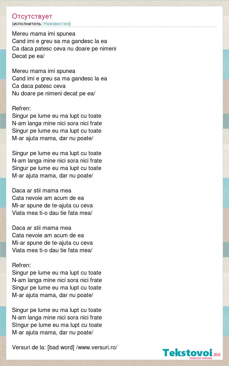 Mereu mama imi spunea Cand imi e greu sa ma gandesc la ea Ca daca patesc ceva nu doare pe nimeni Decat pe ea/ Mereu mama imi spunea Cand imi e greu sa ma gandesc la ea Ca daca patesc ceva Nu doare pe nimeni decat pe ea/ Refren: Singur pe lume eu ma lupt cu toate N-am langa mine nici sora nici frate Singur pe lume eu ma lupt cu toate M-ar ajuta mama, dar nu poate/ Singur pe lume eu ma lupt cu toate N-am langa mine nici sora nici frate Singur pe lume eu ma lupt cu toate M-ar ajuta mama, dar nu poate/ Daca ar stii mama mea Cata nevoie am acum de ea Mi-ar spune de te-ajuta cu ceva Viata mea ti-o dau tie fata mea/ Daca ar stii mama mea Cata nevoie am acum de ea Mi-ar spune de te-ajuta cu ceva Viata mea ti-o dau tie fata mea/ Refren: Singur pe lume eu ma lupt cu toate N-am langa mine nici sora nici frate Singur pe lume eu ma lupt cu toate M-ar ajuta mama, dar nu poate/ Singur pe lume eu ma lupt cu toate N-am langa mine nici sora nici frate Sïngur pe lume eu ma lupt cu toate M-ar ajuta mama, dar nu poate/ Versuri de la: [bad word] /www.versuri.ro/