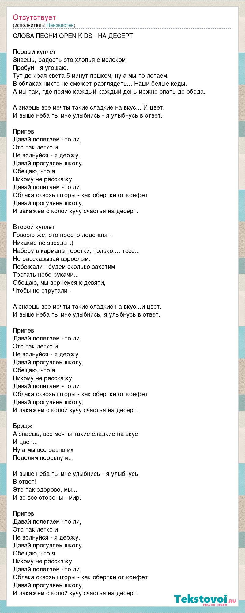 СЛОВА ПЕСНИ OPEN KIDS - НА ДЕСЕРТ Первый куплет Знаешь, радость это хлопья с молоком Пробуй - я угощаю. Тут до края света 5 минут пешком, ну а мы-то летаем. В облаках никто не сможет разглядеть... Наши белые кеды. А мы там, где прямо каждый-каждый день можно спать до обеда. А знаешь все мечты такие сладкие на вкус... И цвет. И выше неба ты мне улыбнись - я улыбнусь в ответ. Припев Давай полетаем что ли, Это так легко и Не волнуйся - я держу. Давай прогуляем школу, Обещаю, что я Никому не расскажу. Давай полетаем что ли, Облака сквозь шторы - как обертки от конфет. Давай прогуляем школу, И закажем с колой кучу счастья на десерт. Второй куплет Говорю же, это просто леденцы - Никакие не звезды :) Наберу в карманы горстки, только.... тссс... Не рассказывай взрослым. Побежали - будем сколько захотим Трогать небо руками... Обещаю, мы вернемся к девяти, Чтобы не отругали . А знаешь все мечты такие сладкие на вкус...и цвет. И выше неба ты мне улыбнись, я улыбнусь в ответ. Припев Давай полетаем что ли, Это так легко и Не волнуйся - я держу. Давай прогуляем школу, Обещаю, что я Никому не расскажу. Давай полетаем что ли, Облака сквозь шторы - как обертки от конфет. Давай прогуляем школу, И закажем с колой кучу счастья на десерт. Бридж А знаешь, все мечты такие сладкие на вкус И цвет... Ну а мы все равно их Поделим поровну и... И выше неба ты мне улыбнись - я улыбнусь В ответ! Это так здорово, мы... И во все стороны - мир. Припев Давай полетаем что ли, Это так легко и Не волнуйся - я держу. Давай прогуляем школу, Обещаю, что я Никому не расскажу. Давай полетаем что ли, Облака сквозь шторы - как обертки от конфет. Давай прогуляем школу, И закажем с колой кучу счастья на десерт.
