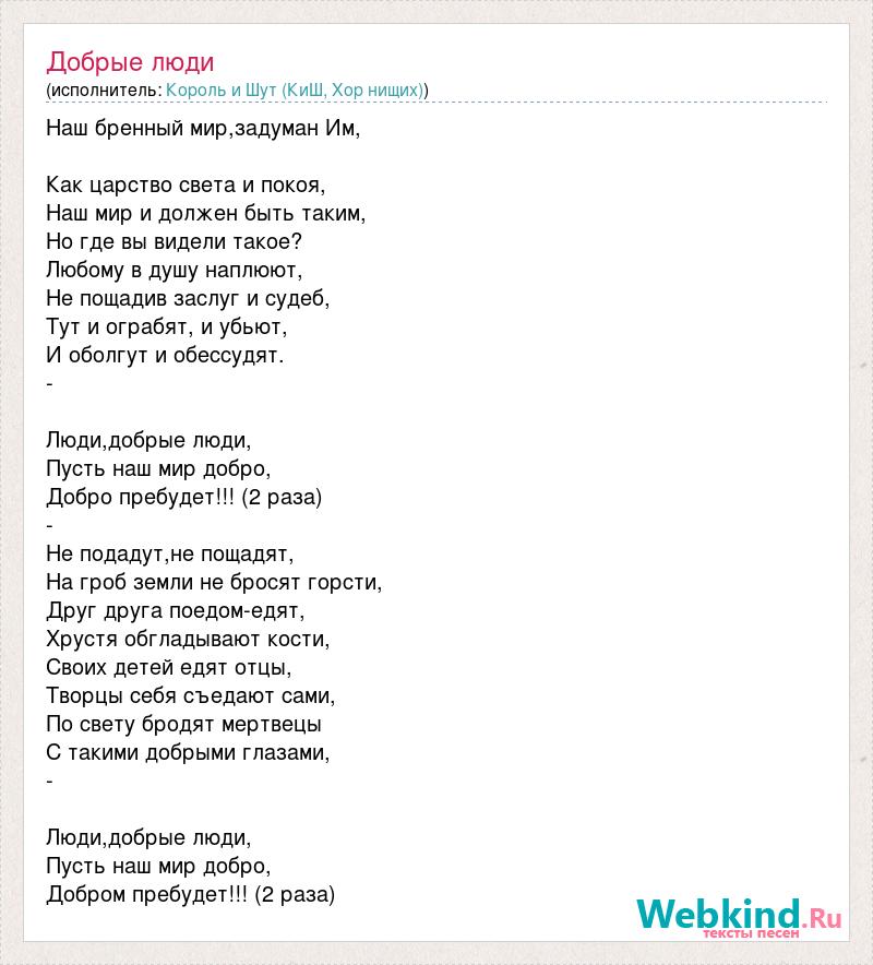 Наш бренный мир,задуман Им, Как царство света и покоя, Наш мир и должен быть таким, Но где вы видели такое? Любому в душу наплюют, Не пощадив заслуг и судеб, Тут и ограбят, и убьют, И оболгут и обессудят. - Люди,добрые люди, Пусть наш мир добро, Добро пребудет!!! (2 раза) - Не подадут,не пощадят, На гроб земли не бросят горсти, Друг друга поедом-едят, Хрустя обгладывают кости, Своих детей едят отцы, Творцы себя съедают сами, По свету бродят мертвецы С такими добрыми глазами, - Люди,добрые люди, Пусть наш мир добро, Добром пребудет!!! (2 раза)