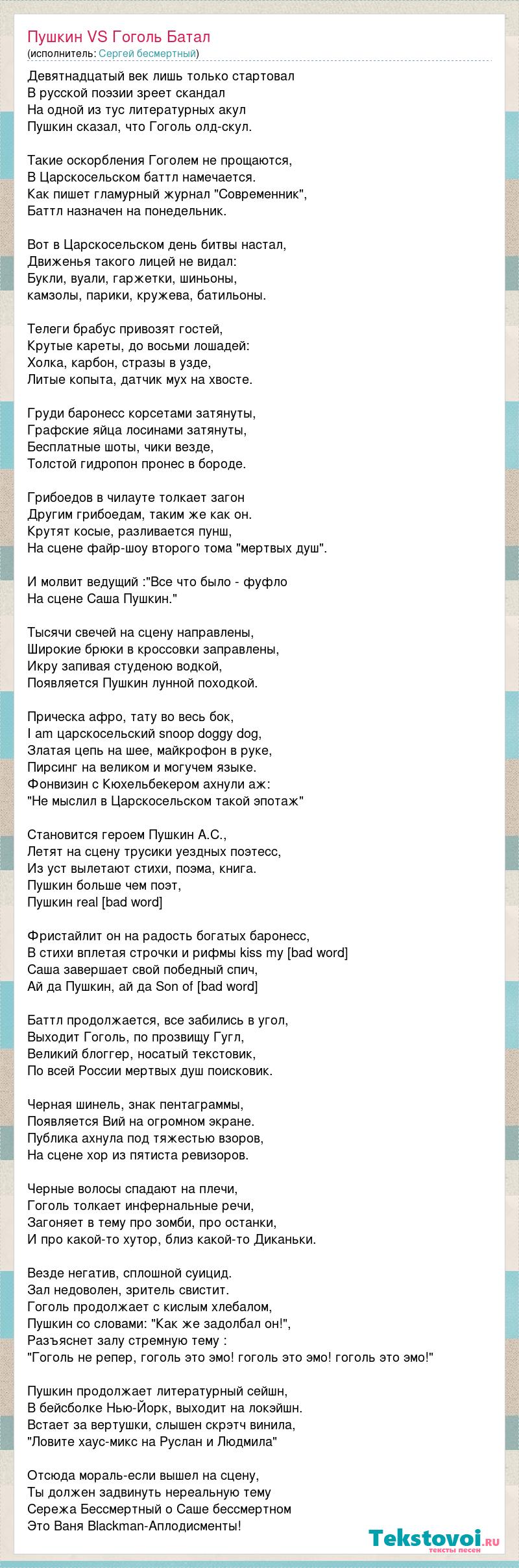 Девятнадцатый век лишь только стартовал В русской поэзии зреет скандал На одной из тус литературных акул Пушкин сказал, что Гоголь олд-скул. Такие оскорбления Гоголем не прощаются, В Царскосельском баттл намечается. Как пишет гламурный журнал "Современник", Баттл назначен на понедельник. Вот в Царскосельском день битвы настал, Движенья такого лицей не видал: Букли, вуали, гаржетки, шиньоны, камзолы, парики, кружева, батильоны. Телеги брабус привозят гостей, Крутые кареты, до восьми лошадей: Холка, карбон, стразы в узде, Литые копыта, датчик мух на хвосте. Груди баронесс корсетами затянуты, Графские яйца лосинами затянуты, Бесплатные шоты, чики везде, Толстой гидропон пронес в бороде. Грибоедов в чилауте толкает загон Другим грибоедам, таким же как он. Крутят косые, разливается пунш, На сцене файр-шоу второго тома "мертвых душ". И молвит ведущий :"Все что было - фуфло На сцене Саша Пушкин." Тысячи свечей на сцену направлены, Широкие брюки в кроссовки заправлены, Икру запивая студеною водкой, Появляется Пушкин лунной походкой. Прическа афро, тату во весь бок, I am царскосельский snoop doggy dog, Златая цепь на шее, майкрофон в руке, Пирсинг на великом и могучем языке. Фонвизин с Кюхельбекером ахнули аж: "Не мыслил в Царскосельском такой эпотаж" Становится героем Пушкин А.С., Летят на сцену трусики уездных поэтесс, Из уст вылетают стихи, поэма, книга. Пушкин больше чем поэт, Пушкин real [bad word] Фристайлит он на радость богатых баронесс, В стихи вплетая строчки и рифмы kiss my [bad word] Саша завершает свой победный спич, Ай да Пушкин, ай да Son of [bad word] Баттл продолжается, все забились в угол, Выходит Гоголь, по прозвищу Гугл, Великий блоггер, носатый текстовик, По всей России мертвых душ поисковик. Черная шинель, знак пентаграммы, Появляется Вий на огромном экране. Публика ахнула под тяжестью взоров, На сцене хор из пятиста ревизоров. Черные волосы спадают на плечи, Гоголь толкает инфернальные речи, Загоняет в тему про зомби, про останки, И про какой-то хутор, близ какой-то Диканьки. Везде негатив, сплошной суицид. Зал недоволен, зритель свистит. Гоголь продолжает с кислым хлебалом, Пушкин со словами: "Как же задолбал он!", Разъяснет залу стремную тему : "Гоголь не репер, гоголь это эмо! гоголь это эмо! гоголь это эмо!" Пушкин продолжает литературный сейшн, В бейсболке Нью-Йорк, выходит на локэйшн. Встает за вертушки, слышен скрэтч винила, "Ловите хаус-микс на Руслан и Людмила" Отсюда мораль-если вышел на сцену, Ты должен задвинуть нереальную тему Сережа Бессмертный о Саше бессмертном Это Ваня Blackman-Аплодисменты!