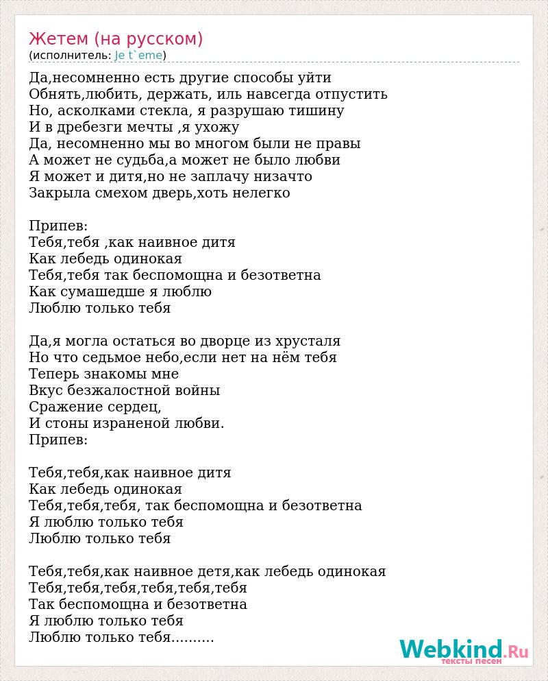 Да,несомненно есть другие способы уйти Обнять,любить, держать, иль навсегда отпустить Но, асколками стекла, я разрушаю тишину И в дребезги мечты ,я ухожу Да, несомненно мы во многом были не правы А может не судьба,а может не было любви Я может и дитя,но не заплачу низачто Закрыла смехом дверь,хоть нелегко Припев: Тебя,тебя ,как наивное дитя Как лебедь одинокая Тебя,тебя так беспомощна и безответна Как сумашедше я люблю Люблю только тебя Да,я могла остаться во дворце из хрусталя Но что седьмое небо,если нет на нём тебя Теперь знакомы мне Вкус безжалостной войны Сражение сердец, И стоны израненой любви. Припев: Тебя,тебя,как наивное дитя Как лебедь одинокая Тебя,тебя,тебя, так беспомощна и безответна Я люблю только тебя Люблю только тебя Тебя,тебя,как наивное детя,как лебедь одинокая Тебя,тебя,тебя,тебя,тебя,тебя Так беспомощна и безответна Я люблю только тебя Люблю только тебя..........