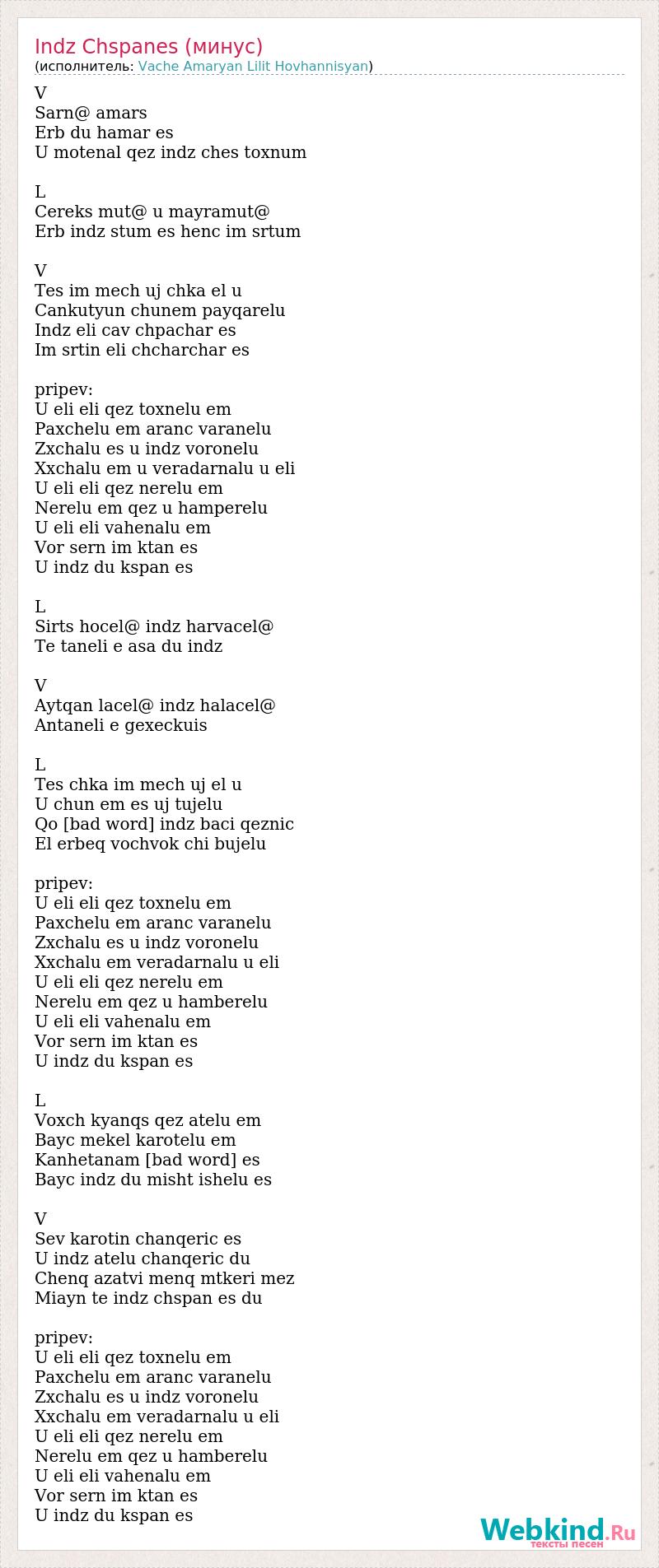 V Sarn@ amars Erb du hamar es U motenal qez indz ches toxnum L Cereks mut@ u mayramut@ Erb indz stum es henc im srtum V Tes im mech uj chka el u Cankutyun chunem payqarelu Indz eli cav chpachar es Im srtin eli chcharchar es pripev: U eli eli qez toxnelu em Paxchelu em aranc varanelu Zxchalu es u indz voronelu Xxchalu em u veradarnalu u eli U eli eli qez nerelu em Nerelu em qez u hamperelu U eli eli vahenalu em Vor sern im ktan es U indz du kspan es L Sirts hocel@ indz harvacel@ Te taneli e asa du indz V Aytqan lacel@ indz halacel@ Antaneli e gexeckuis L Tes chka im mech uj el u U chun em es uj tujelu Qo [bad word] indz baci qeznic El erbeq vochvok chi bujelu pripev: U eli eli qez toxnelu em Paxchelu em aranc varanelu Zxchalu es u indz voronelu Xxchalu em veradarnalu u eli U eli eli qez nerelu em Nerelu em qez u hamberelu U eli eli vahenalu em Vor sern im ktan es U indz du kspan es L Voxch kyanqs qez atelu em Bayc mekel karotelu em Kanhetanam [bad word] es Bayc indz du misht ishelu es V Sev karotin chanqeric es U indz atelu chanqeric du Chenq azatvi menq mtkeri mez Miayn te indz chspan es du pripev: U eli eli qez toxnelu em Paxchelu em aranc varanelu Zxchalu es u indz voronelu Xxchalu em veradarnalu u eli U eli eli qez nerelu em Nerelu em qez u hamberelu U eli eli vahenalu em Vor sern im ktan es U indz du kspan es
