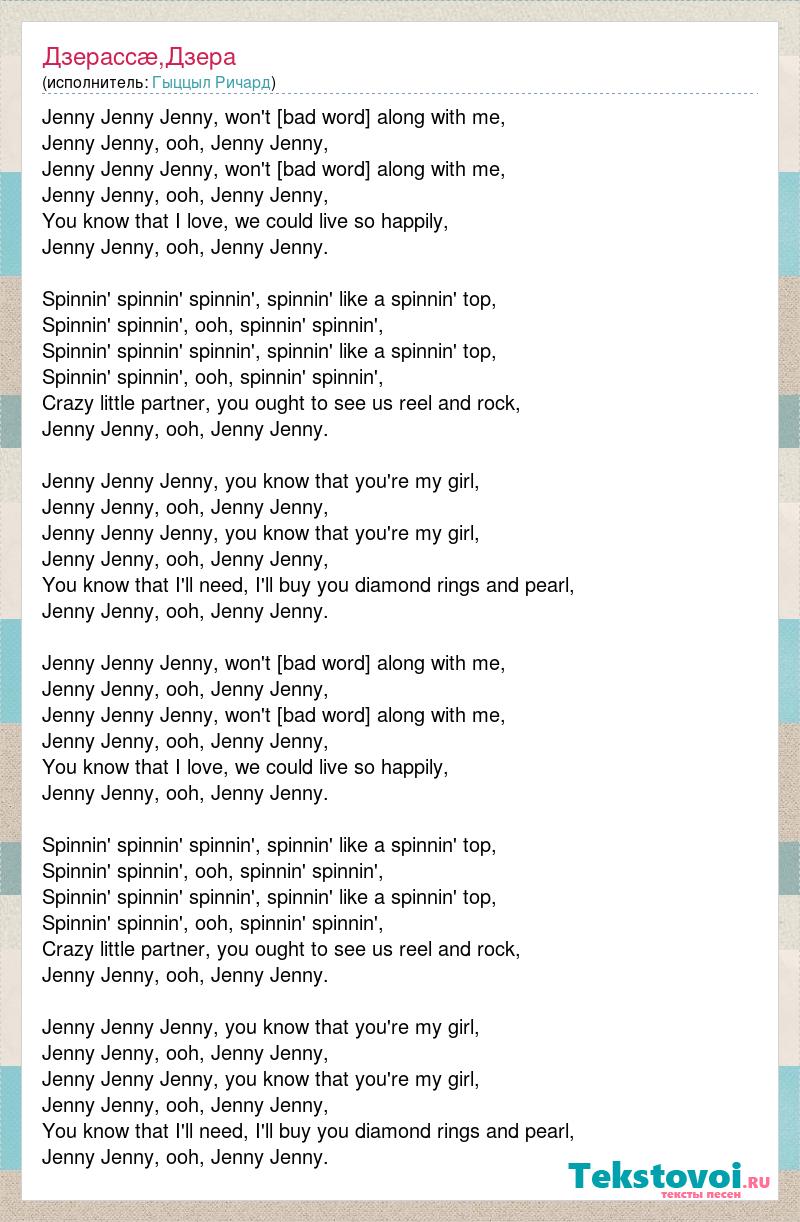 Jenny Jenny Jenny, won't you come along with me, Jenny Jenny, ooh, Jenny Jenny, Jenny Jenny Jenny, won't you come along with me, Jenny Jenny, ooh, Jenny Jenny, You know that I love, we could live so happily, Jenny Jenny, ooh, Jenny Jenny. Spinnin' spinnin' spinnin', spinnin' like a spinnin' top, Spinnin' spinnin', ooh, spinnin' spinnin', Spinnin' spinnin' spinnin', spinnin' like a spinnin' top, Spinnin' spinnin', ooh, spinnin' spinnin', Crazy little partner, you ought to see us reel and rock, Jenny Jenny, ooh, Jenny Jenny. Jenny Jenny Jenny, you know that you're my girl, Jenny Jenny, ooh, Jenny Jenny, Jenny Jenny Jenny, you know that you're my girl, Jenny Jenny, ooh, Jenny Jenny, You know that I'll need, I'll buy you diamond rings and pearl, Jenny Jenny, ooh, Jenny Jenny. Jenny Jenny Jenny, won't you come along with me, Jenny Jenny, ooh, Jenny Jenny, Jenny Jenny Jenny, won't you come along with me, Jenny Jenny, ooh, Jenny Jenny, You know that I love, we could live so happily, Jenny Jenny, ooh, Jenny Jenny. Spinnin' spinnin' spinnin', spinnin' like a spinnin' top, Spinnin' spinnin', ooh, spinnin' spinnin', Spinnin' spinnin' spinnin', spinnin' like a spinnin' top, Spinnin' spinnin', ooh, spinnin' spinnin', Crazy little partner, you ought to see us reel and rock, Jenny Jenny, ooh, Jenny Jenny. Jenny Jenny Jenny, you know that you're my girl, Jenny Jenny, ooh, Jenny Jenny, Jenny Jenny Jenny, you know that you're my girl, Jenny Jenny, ooh, Jenny Jenny, You know that I'll need, I'll buy you diamond rings and pearl, Jenny Jenny, ooh, Jenny Jenny.