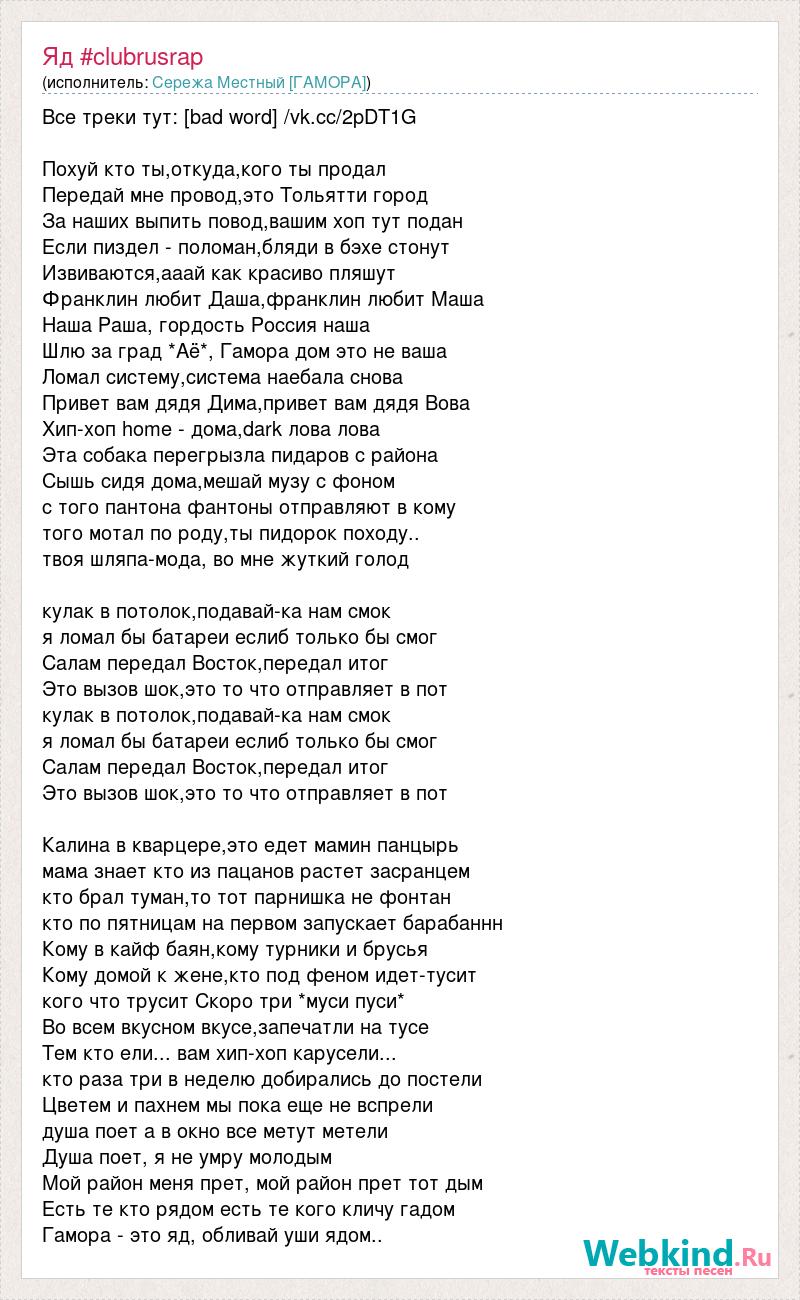 Все треки тут: [bad word] /vk.cc/2pDT1G Похуй кто ты,откуда,кого ты продал Передай мне провод,это Тольятти город За наших выпить повод,вашим хоп тут подан Если пиздел - поломан,бляди в бэхе стонут Извиваются,ааай как красиво пляшут Франклин любит Даша,франклин любит Маша Наша Раша, гордость Россия наша Шлю за град *Аё*, Гамора дом это не ваша Ломал систему,система наебала снова Привет вам дядя Дима,привет вам дядя Вова Хип-хоп homе - дома,dark лова лова Эта собака перегрызла пидаров с района Сышь сидя дома,мешай музу с фоном с того пантона фантоны отправляют в кому того мотал по роду,ты пидорок походу.. твоя шляпа-мода, во мне жуткий голод кулак в потолок,подавай-ка нам смок я ломал бы батареи еслиб только бы смог Салам передал Восток,передал итог Это вызов шок,это то что отправляет в пот кулак в потолок,подавай-ка нам смок я ломал бы батареи еслиб только бы смог Салам передал Восток,передал итог Это вызов шок,это то что отправляет в пот Калина в кварцере,это едет мамин панцырь мама знает кто из пацанов растет засранцем кто брал туман,то тот парнишка не фонтан кто по пятницам на первом запускает барабаннн Кому в кайф баян,кому турники и брусья Кому домой к жене,кто под феном идет-тусит кого что трусит Скоро три *муси пуси* Во всем вкусном вкусе,запечатли на тусе Тем кто ели... вам хип-хоп карусели... кто раза три в неделю добирались до постели Цветем и пахнем мы пока еще не вспрели душа поет а в окно все метут метели Душа поет, я не умру молодым Мой район меня прет, мой район прет тот дым Есть те кто рядом есть те кого кличу гадом Гамора - это яд, обливай уши ядом..