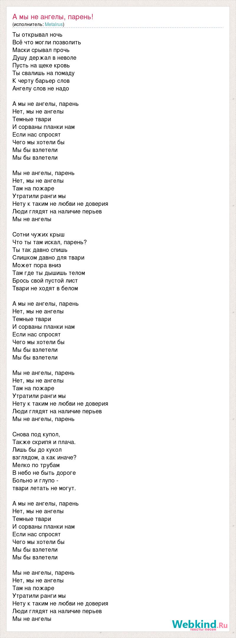Ты открывал ночь Всё что могли позволить Маски срывал прочь Душу держал в неволе Пусть на щеке кровь Ты свалишь на помаду К черту барьер слов Ангелу слов не надо А мы не ангелы, парень Нет, мы не ангелы Темные твари И сорваны планки нам Если нас спросят Чего мы хотели бы Мы бы взлетели Мы бы взлетели Мы не ангелы, парень Нет, мы не ангелы Там на пожаре Утратили ранги мы Нету к таким не любви не доверия Люди глядят на наличие перьев Мы не ангелы Сотни чужих крыш Что ты там искал, парень? Ты так давно спишь Слишком давно для твари Может пора вниз Там где ты дышишь телом Брось свой пустой лист Твари не ходят в белом А мы не ангелы, парень Нет, мы не ангелы Темные твари И сорваны планки нам Если нас спросят Чего мы хотели бы Мы бы взлетели Мы бы взлетели Мы не ангелы, парень Нет, мы не ангелы Там на пожаре Утратили ранги мы Нету к таким не любви не доверия Люди глядят на наличие перьев Мы не ангелы, парень Снова под купол, Также скрипя и плача. Лишь бы до кукол взглядом, а как иначе? Мелко по трубам В небо не быть дороге Больно и глупо - твари летать не могут. А мы не ангелы, парень Нет, мы не ангелы Темные твари И сорваны планки нам Если нас спросят Чего мы хотели бы Мы бы взлетели Мы бы взлетели Мы не ангелы, парень Нет, мы не ангелы Там на пожаре Утратили ранги мы Нету к таким не любви не доверия Люди глядят на наличие перьев Мы не ангелы
