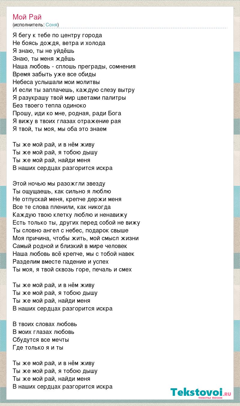 Я бегу к тебе по центру города Не боясь дождя, ветра и холода Я знаю, ты не уйдёшь Знаю, ты меня ждёшь Наша любовь - сплошь преграды, сомнения Время забыть уже все обиды Небеса услышали мои молитвы И если ты заплачешь, каждую слезу вытру Я разукрашу твой мир цветами палитры Без твоего тепла одиноко Прошу, иди ко мне, родная, ради Бога Я вижу в твоих глазах отражение рая Я твой, ты моя, мы оба это знаем Ты же мой рай, и в нём живу Ты же мой рай, я тобою дышу Ты же мой рай, найди меня В наших сердцах разгорится искра Этой ночью мы разожгли звезду Ты ощущаешь, как сильно я люблю Не отпускай меня, крепче держи меня Все те слова пленили, как никогда Каждую твою клетку люблю и ненавижу Есть только ты, других перед собой не вижу Ты словно ангел с небес, подарок свыше Моя причина, чтобы жить, мой смысл жизни Самый родной и близкий в мире человек Наша любовь всё крепче, мы с тобой навек Разделим вместе падение и успех Ты моя, я твой сквозь горе, печаль и смех Ты же мой рай, и в нём живу Ты же мой рай, я тобою дышу Ты же мой рай, найди меня В наших сердцах разгорится искра В твоих словах любовь В моих глазах любовь Сбудутся все мечты Где только я и ты Ты же мой рай, и в нём живу Ты же мой рай, я тобою дышу Ты же мой рай, найди меня В наших сердцах разгорится искра