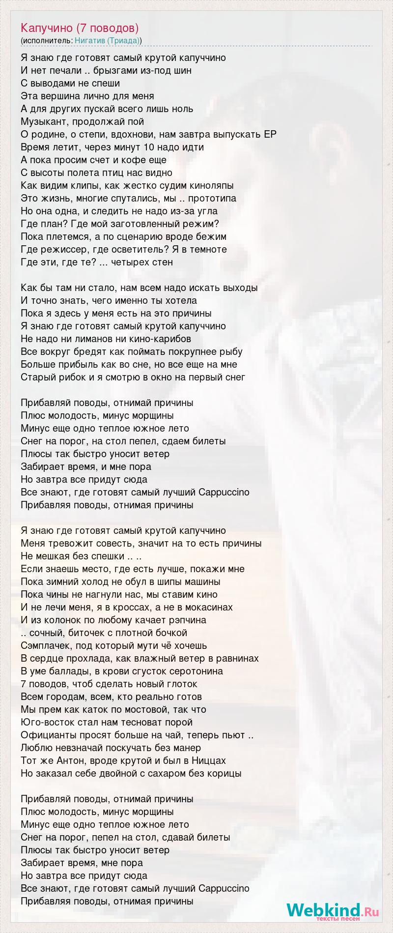 Я знаю где готовят самый крутой капуччино И нет печали .. брызгами из-под шин С выводами не спеши Эта вершина лично для меня А для других пускай всего лишь ноль Музыкант, продолжай пой О родине, о степи, вдохнови, нам завтра выпускать EP Время летит, через минут 10 надо идти А пока просим счет и кофе еще С высоты полета птиц нас видно Как видим клипы, как жестко судим киноляпы Это жизнь, многие спутались, мы .. прототипа Но она одна, и следить не надо из-за угла Где план? Где мой заготовленный режим? Пока плетемся, а по сценарию вроде бежим Где режиссер, где осветитель? Я в темноте Где эти, где те? ... четырех стен Как бы там ни стало, нам всем надо искать выходы И точно знать, чего именно ты хотела Пока я здесь у меня есть на это причины Я знаю где готовят самый крутой капуччино Не надо ни лиманов ни кино-карибов Все вокруг бредят как поймать покрупнее рыбу Больше прибыль как во сне, но все еще на мне Старый рибок и я смотрю в окно на первый снег Прибавляй поводы, отнимай причины Плюс молодость, минус морщины Минус еще одно теплое южное лето Снег на порог, на стол пепел, сдаем билеты Плюсы так быстро уносит ветер Забирает время, и мне пора Но завтра все придут сюда Все знают, где готовят самый лучший Сappuccino Прибавляя поводы, отнимая причины Я знаю где готовят самый крутой капуччино Меня тревожит совесть, значит на то есть причины Не мешкая без спешки .. .. Если знаешь место, где есть лучше, покажи мне Пока зимний холод не обул в шипы машины Пока чины не нагнули нас, мы ставим кино И не лечи меня, я в кроссах, а не в мокасинах И из колонок по любому качает рэпчина .. сочный, биточек с плотной бочкой Сэмплачек, под который мути чё хочешь В сердце прохлада, как влажный ветер в равнинах В уме баллады, в крови сгусток серотонина 7 поводов, чтоб сделать новый глоток Всем городам, всем, кто реально готов Мы прем как каток по мостовой, так что Юго-восток стал нам тесноват порой Официанты просят больше на чай, теперь пьют .. Люблю невзначай поскучать без манер Тот же Антон, вроде крутой и был в Ниццах Но заказал себе двойной с сахаром без корицы Прибавляй поводы, отнимай причины Плюс молодость, минус морщины Минус еще одно теплое южное лето Снег на порог, пепел на стол, сдавай билеты Плюсы так быстро уносит ветер Забирает время, мне пора Но завтра все придут сюда Все знают, где готовят самый лучший Сappuccino Прибавляя поводы, отнимая причины