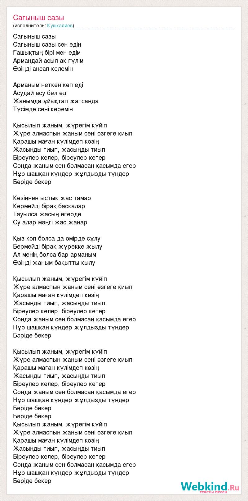 Сағыныш сазы Сағыныш сазы сен едің Ғашықтың бірі мен едім Армандай асыл ақ гүлім Өзіңді аңсап келемін Арманым неткен көп еді Асудай асу бел еді Жанымда ұйықтап жатсаңда Түсімде сені көремін Қысылып жаным, жүрегім күйіп Жүре алмаспын жаным сені өзгеге қиып Қарашы маған күлімдеп көзің Жасыңды тиып, жасыңды тиып Біреулер келер, біреулер кетер Сонда жаным сен болмасаң қасымда егер Нұр шашқан күндер жұлдызды түндер Бәріде бекер Көзіңнен ыстық жас тамар Көрмейді бірақ басқалар Тауылса жасың егерде Су алар мәңгі жас жанар Қыз көп болса да өмірде сұлу Бермейді бірақ жүрекке жылу Ал менің болса бар арманым Өзіңді жаным бақытты қылу Қысылып жаным, жүрегім күйіп Жүре алмаспын жаным сені өзгеге қиып Қарашы маған күлімдеп көзің Жасыңды тиып, жасыңды тиып Біреулер келер, біреулер кетер Сонда жаным сен болмасаң қасымда егер Нұр шашқан күндер жұлдызды түндер Бәріде бекер Қысылып жаным, жүрегім күйіп Жүре алмаспын жаным сені өзгеге қиып Қарашы маған күлімдеп көзің Жасыңды тиып, жасыңды тиып Біреулер келер, біреулер кетер Сонда жаным сен болмасаң қасымда егер Нұр шашқан күндер жұлдызды түндер Бәріде бекер Бәріде бекер Қысылып жаным, жүрегім күйіп Жүре алмаспын жаным сені өзгеге қиып Қарашы маған күлімдеп көзің Жасыңды тиып, жасыңды тиып Біреулер келер, біреулер кетер Сонда жаным сен болмасаң қасымда егер Нұр шашқан күндер жұлдызды түндер Бәріде бекер