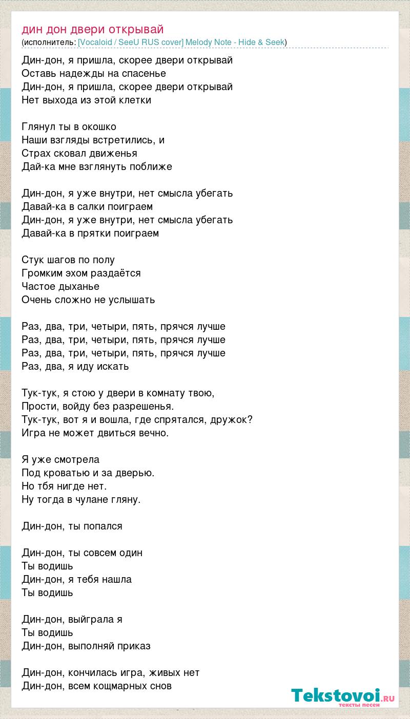 Дин-дон, я пришла, скорее двери открывай Оставь надежды на спасенье Дин-дон, я пришла, скорее двери открывай Нет выхода из этой клетки Глянул ты в окошко Наши взгляды встретились, и Страх сковал движенья Дай-ка мне взглянуть поближе Дин-дон, я уже внутри, нет смысла убегать Давай-ка в салки поиграем Дин-дон, я уже внутри, нет смысла убегать Давай-ка в прятки поиграем Стук шагов по полу Громким эхом раздаётся Частое дыханье Очень сложно не услышать Раз, два, три, четыри, пять, прячся лучше Раз, два, три, четыри, пять, прячся лучше Раз, два, три, четыри, пять, прячся лучше Раз, два, я иду искать Тук-тук, я стою у двери в комнату твою, Прости, войду без разрешенья. Тук-тук, вот я и вошла, где спрятался, дружок? Игра не может двиться вечно. Я уже смотрела Под кроватью и за дверью. Но тбя нигде нет. Ну тогда в чулане гляну. Дин-дон, ты попался Дин-дон, ты совсем один Ты водишь Дин-дон, я тебя нашла Ты водишь Дин-дон, выйграла я Ты водишь Дин-дон, выполняй приказ Дин-дон, кончилась игра, живых нет Дин-дон, всем кощмарных снов