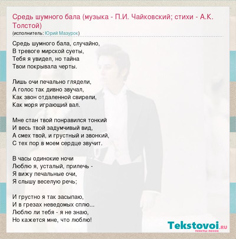 Главная→Исполнители→Юрий Мазурок→Средь шумного бала (музыка - П.И. Чайковский; стихи - А.К. Толстой)