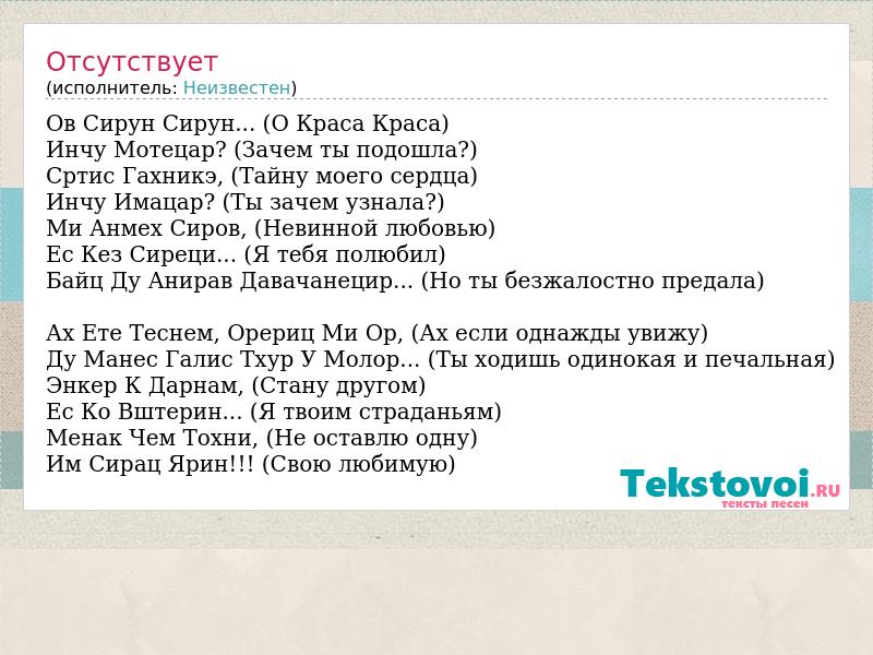 Ов Сирун Сирун... (О Краса Краса) Инчу Мотецар? (Зачем ты подошла?) Сртис Гахникэ, (Тайну моего сердца) Инчу Имацар? (Ты зачем узнала?) Ми Анмех Сиров, (Невинной любовью) Ес Кез Сиреци... (Я тебя полюбил) Байц Ду Анирав Давачанецир... (Но ты безжалостно предала) Ах Ете Теснем, Орериц Ми Ор, (Ах если однажды увижу) Ду Манес Галис Тхур У Молор... (Ты ходишь одинокая и печальная) Энкер К Дарнам, (Стану другом) Ес Ко Вштерин... (Я твоим страданьям) Менак Чем Тохни, (Не оставлю одну) Им Сирац Ярин!!! (Свою любимую)