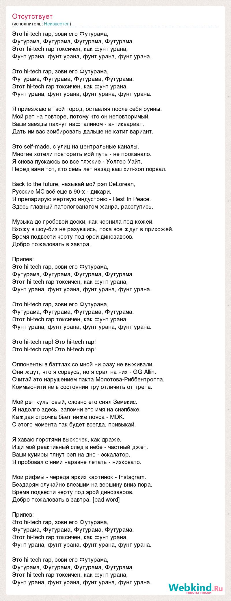 Это hi-tech rap, зови его Футурама, Футурама, Футурама, Футурама, Футурама. Этот hi-tech rap токсичен, как фунт урана, Фунт урана, фунт урана, фунт урана, фунт урана. Это hi-tech rap, зови его Футурама, Футурама, Футурама, Футурама, Футурама. Этот hi-tech rap токсичен, как фунт урана, Фунт урана, фунт урана, фунт урана, фунт урана. Я приезжаю в твой город, оставляя после себя руины. Мой рэп на повторе, потому что он неповторимый. Ваши звезды пахнут нафталином - антиквариат. Дать им вас зомбировать дальше не катит вариант. Это self-made, с улиц на центральные каналы. Многие хотели повторить мой путь - не проканало. Я снова пускаюсь во все тяжкие - Уолтер Уайт. Перед вами тот, кто семь лет назад ваш хип-хоп порвал. Back to the future, называй мой рэп DeLorean, Русские MC всё еще в 90-х - дикари. Я препарирую мертвую индустрию - Rest In Peace. Здесь главный патологоанатом жанра, расступись. Музыка до гробовой доски, как чернила под кожей. Вхожу в шоу-биз не разувшись, пока все ждут в прихожей. Время подвести черту под эрой динозавров. Добро пожаловать в завтра. Припев: Это hi-tech rap, зови его Футурама, Футурама, Футурама, Футурама, Футурама. Этот hi-tech rap токсичен, как фунт урана, Фунт урана, фунт урана, фунт урана, фунт урана. Это hi-tech rap, зови его Футурама, Футурама, Футурама, Футурама, Футурама. Этот hi-tech rap токсичен, как фунт урана, Фунт урана, фунт урана, фунт урана, фунт урана. Это hi-tech rap! Это hi-tech rap! Это hi-tech rap! Это hi-tech rap! Оппоненты в бэттлах со мной ни разу не выживали. Они ждут, что я сорвусь, но я срал на них - GG Allin. Считай это нарушением пакта Молотова-Риббентроппа. Коммьюнити не в состоянии тру отличить от трепа. Мой рэп культовый, словно его снял Земекис. Я надолго здесь, запомни это имя на снэпбэке. Каждая строчка бьет ниже пояса - MDK. С этого момента так будет всегда, привыкай. Я хаваю горстями выскочек, как драже. Ищи мой реактивный след в небе - частный джет. Ваши кумиры тянут рэп на дно - эскалатор. Я пробовал с ними наравне летать - низковато. Мои рифмы - череда ярких картинок - Instagram. Бездарям случайно влезшим на вершину вниз пора. Время подвести черту под эрой динозавров. Добро пожаловать в завтра. [bad word] Припев: Это hi-tech rap, зови его Футурама, Футурама, Футурама, Футурама, Футурама. Этот hi-tech rap токсичен, как фунт урана, Фунт урана, фунт урана, фунт урана, фунт урана. Это hi-tech rap, зови его Футурама, Футурама, Футурама, Футурама, Футурама. Этот hi-tech rap токсичен, как фунт урана, Фунт урана, фунт урана, фунт урана, фунт урана.