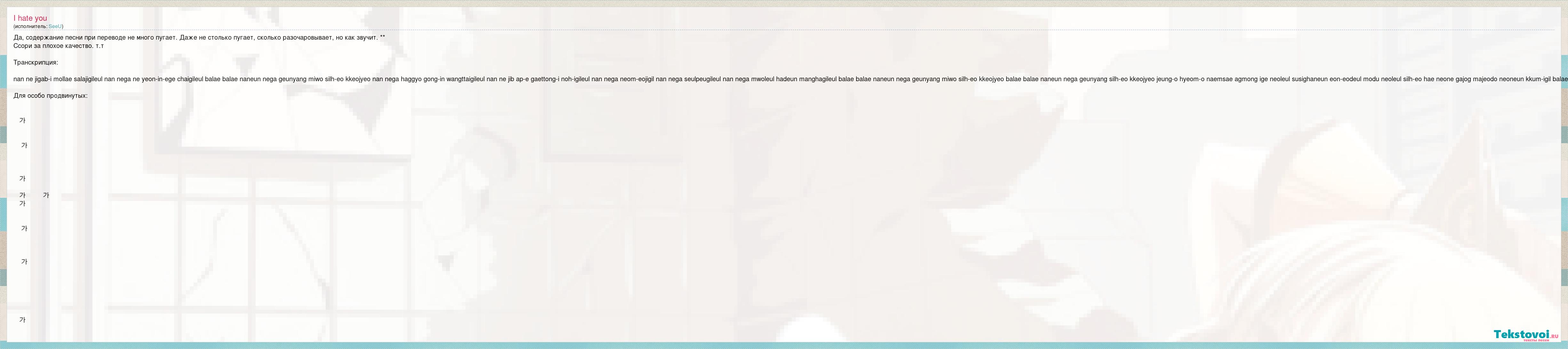 Да, содержание песни при переводе не много пугает. Даже не столько пугает, сколько разочаровывает, но как звучит. ** Ссори за плохое качество. т.т Транскрипция: nan ne jigab-i mollae salajigileul nan nega ne yeon-in-ege chaigileul balae balae naneun nega geunyang miwo silh-eo kkeojyeo nan nega haggyo gong-in wangttaigileul nan ne jib ap-e gaettong-i noh-igileul nan nega neom-eojigil nan nega seulpeugileul nan nega mwoleul hadeun manghagileul balae balae naneun nega geunyang miwo silh-eo kkeojyeo balae balae naneun nega geunyang silh-eo kkeojyeo jeung-o hyeom-o naemsae agmong ige neoleul susighaneun eon-eodeul modu neoleul silh-eo hae neone gajog majeodo neoneun kkum-igil balae Для особо продвинутых: 난 네 지갑이 몰래 사라지기를 난 네가 네 연인에게 차이기를 바래 바래 나는 네가 그냥 미워 싫어 꺼져 난 네가 학교 공인 왕따이기를 난 네 집 앞에 개똥이 놓이기를 난 네가 넘어지길 난 네가 슬프기를 난 네가 뭐를 하든 망하기를 바래 바래 나는 네가 그냥 미워 싫어 꺼져 바래 바래 나는 네가 그냥 싫어 꺼져 증오 혐오 냄새 악몽 이게 너를 수식하는 언어들 모두 너를 싫어 해 너네 가족 마저도 너는 꿈이길 바래