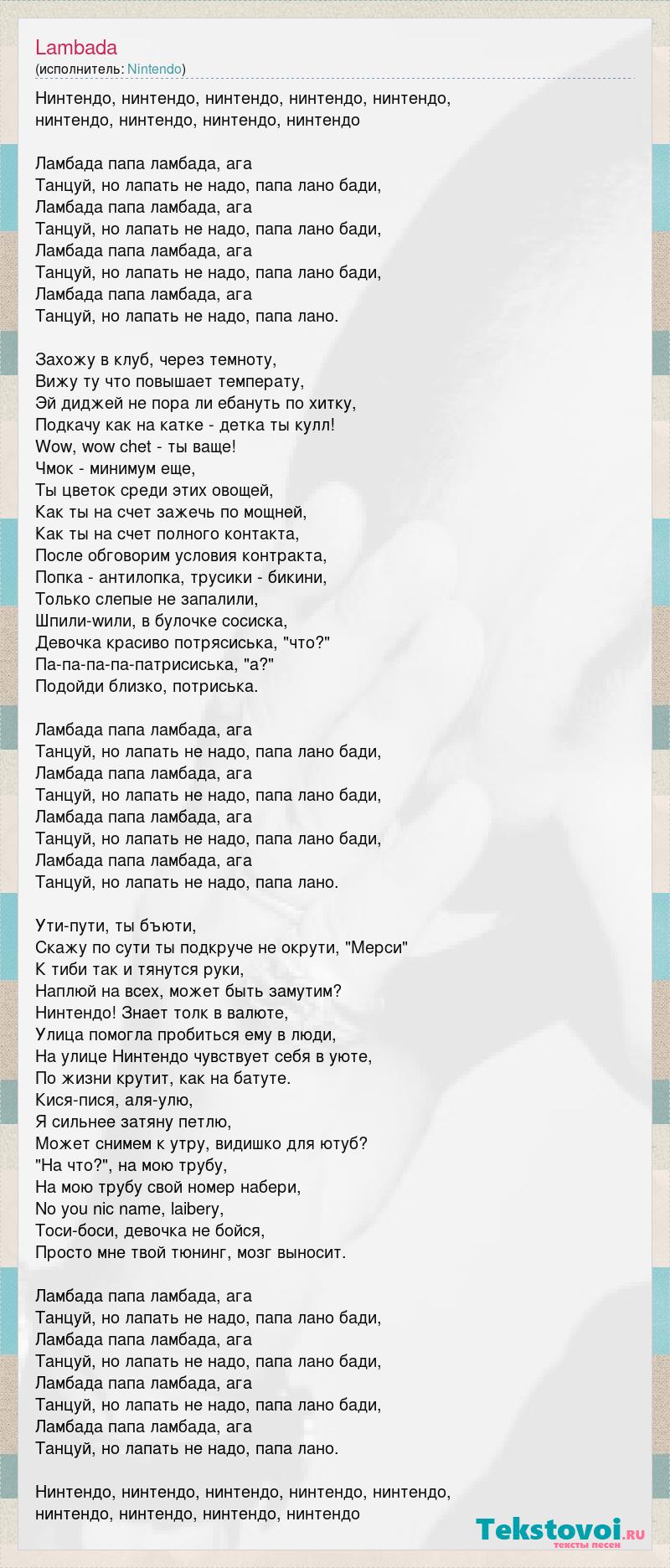 Нинтендо, нинтендо, нинтендо, нинтендо, нинтендо, нинтендо, нинтендо, нинтендо, нинтендо Ламбада папа ламбада, ага Танцуй, но лапать не надо, папа лано бади, Ламбада папа ламбада, ага Танцуй, но лапать не надо, папа лано бади, Ламбада папа ламбада, ага Танцуй, но лапать не надо, папа лано бади, Ламбада папа ламбада, ага Танцуй, но лапать не надо, папа лано. Захожу в клуб, через темноту, Вижу ту что повышает температу, Эй диджей не пора ли ебануть по хитку, Подкачу как на катке - детка ты кулл! Wow, wow chet - ты ваще! Чмок - минимум еще, Ты цветок среди этих овощей, Как ты на счет зажечь по мощней, Как ты на счет полного контакта, После обговорим условия контракта, Попка - антилопка, трусики - бикини, Только слепые не запалили, Шпили-wили, в булочке сосиска, Девочка красиво потрясиська, "что?" Па-па-па-па-патрисиська, "а?" Подойди близко, потриська. Ламбада папа ламбада, ага Танцуй, но лапать не надо, папа лано бади, Ламбада папа ламбада, ага Танцуй, но лапать не надо, папа лано бади, Ламбада папа ламбада, ага Танцуй, но лапать не надо, папа лано бади, Ламбада папа ламбада, ага Танцуй, но лапать не надо, папа лано. Ути-пути, ты бъюти, Скажу по сути ты подкруче не окрути, "Мерси" К тиби так и тянутся руки, Наплюй на всех, может быть замутим? Нинтендо! Знает толк в валюте, Улица помогла пробиться ему в люди, На улице Нинтендо чувствует себя в уюте, По жизни крутит, как на батуте. Кися-пися, аля-улю, Я сильнее затяну петлю, Может снимем к утру, видишко для ютуб? "На что?", на мою трубу, На мою трубу свой номер набери, No you nic name, laibery, Тоси-боси, девочка не бойся, Просто мне твой тюнинг, мозг выносит. Ламбада папа ламбада, ага Танцуй, но лапать не надо, папа лано бади, Ламбада папа ламбада, ага Танцуй, но лапать не надо, папа лано бади, Ламбада папа ламбада, ага Танцуй, но лапать не надо, папа лано бади, Ламбада папа ламбада, ага Танцуй, но лапать не надо, папа лано. Нинтендо, нинтендо, нинтендо, нинтендо, нинтендо, нинтендо, нинтендо, нинтендо, нинтендо