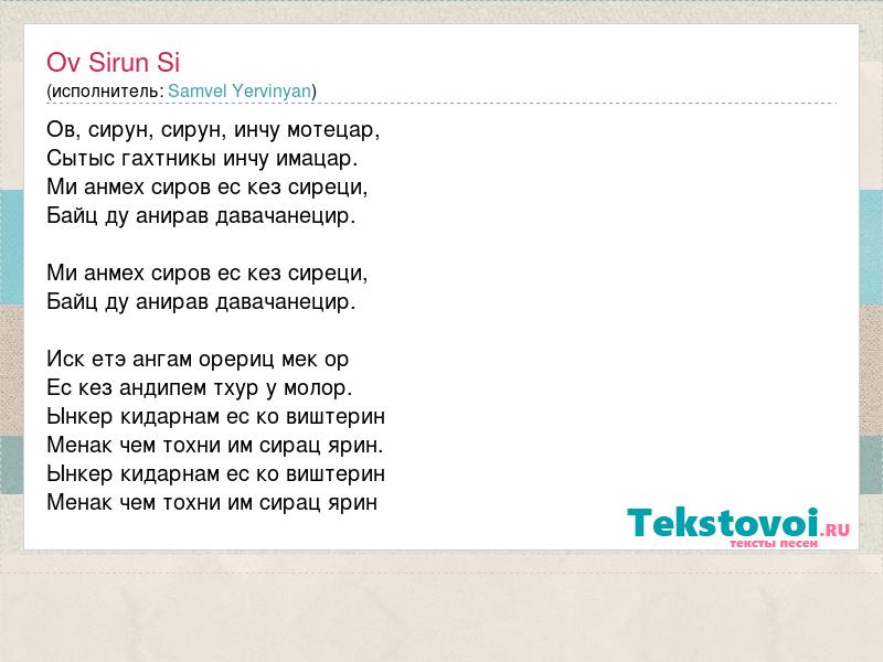 Ов, сирун, сирун, инчу мотецар, Сытыс гахтникы инчу имацар. Ми анмех сиров ес кез сиреци, Байц ду анирав давачанецир. Ми анмех сиров ес кез сиреци, Байц ду анирав давачанецир. Иск етэ ангам орериц мек ор Ес кез андипем тхур у молор. Ынкер кидарнам ес ко виштерин Менак чем тохни им сирац ярин. Ынкер кидарнам ес ко виштерин Менак чем тохни им сирац ярин