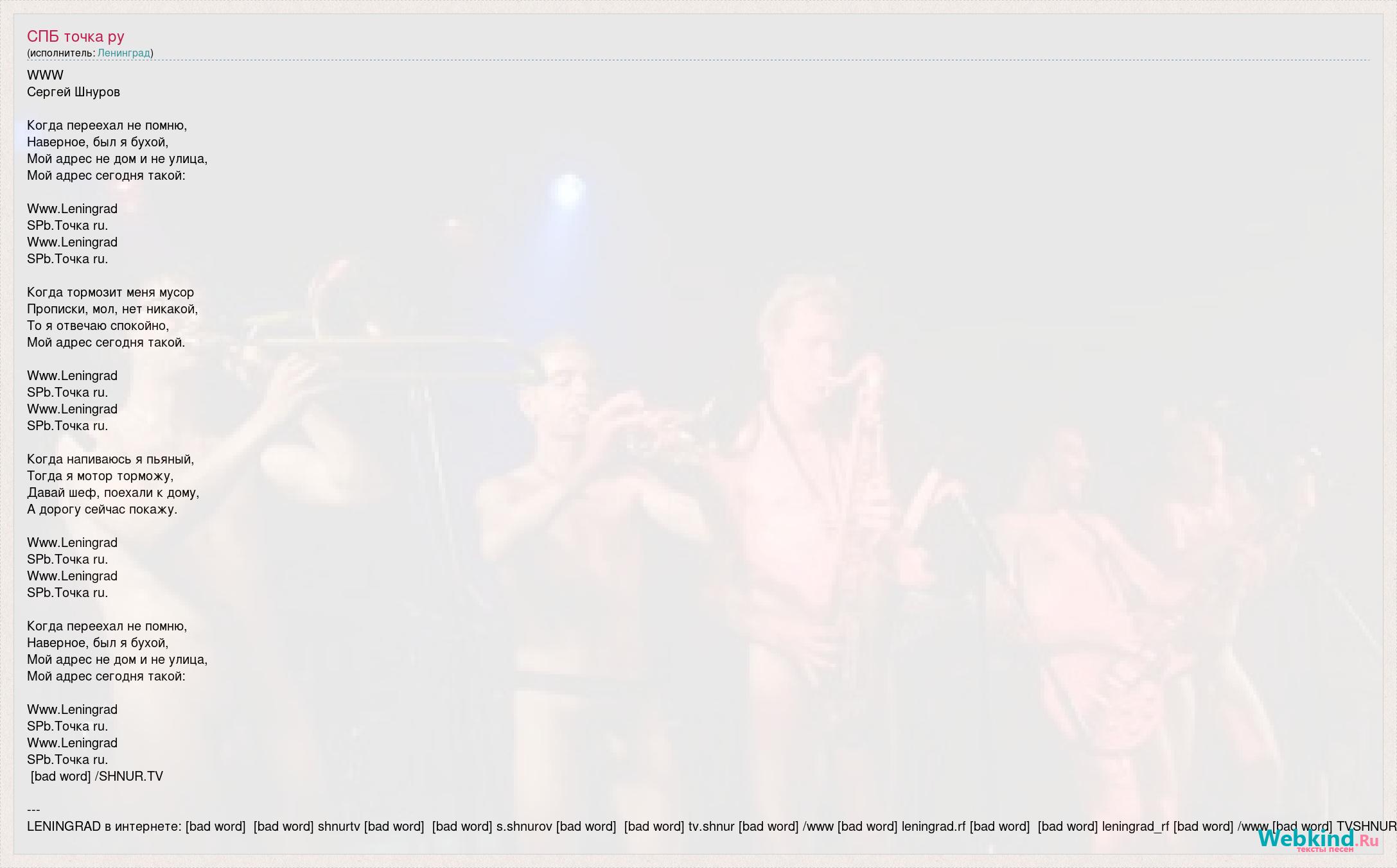 WWW Сергей Шнуров Когда переехал не помню, Наверное, был я бухой, Мой адрес не дом и не улица, Мой адрес сегодня такой: Www.Leningrad SPb.Точка ru. Www.Leningrad SPb.Точка ru. Когда тормозит меня мусор Прописки, мол, нет никакой, То я отвечаю спокойно, Мой адрес сегодня такой. Www.Leningrad SPb.Точка ru. Www.Leningrad SPb.Точка ru. Когда напиваюсь я пьяный, Тогда я мотор торможу, Давай шеф, поехали к дому, А дорогу сейчас покажу. Www.Leningrad SPb.Точка ru. Www.Leningrad SPb.Точка ru. Когда переехал не помню, Наверное, был я бухой, Мой адрес не дом и не улица, Мой адрес сегодня такой: Www.Leningrad SPb.Точка ru. Www.Leningrad SPb.Точка ru. [bad word] /SHNUR.TV --- LENINGRAD в интернете: [bad word] [bad word] shnurtv [bad word] [bad word] s.shnurov [bad word] [bad word] tv.shnur [bad word] /www [bad word] leningrad.rf [bad word] [bad word] leningrad_rf [bad word] /www [bad word] TVSHNUR