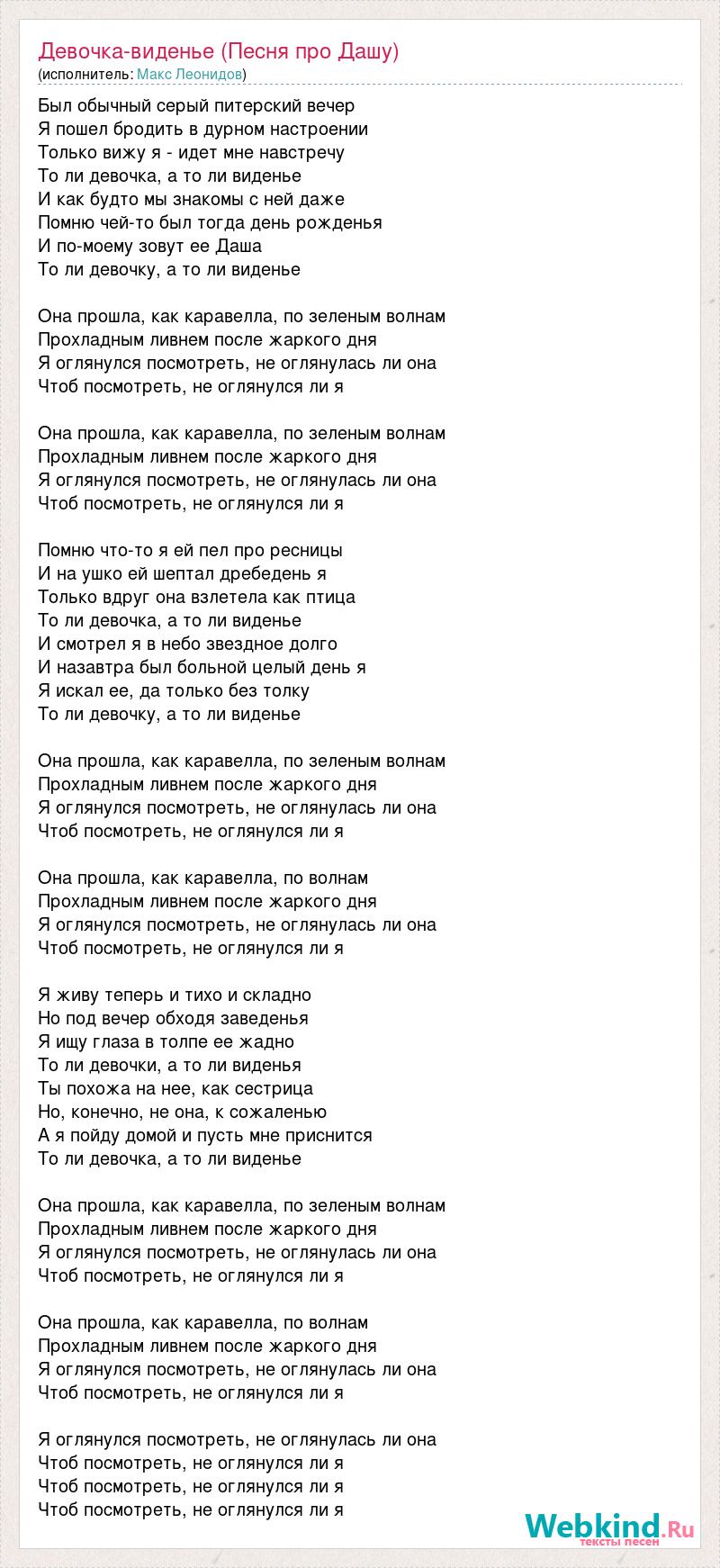 Был обычный серый питерский вечер Я пошел бродить в дурном настроении Только вижу я - идет мне навстречу То ли девочка, а то ли виденье И как будто мы знакомы с ней даже Помню чей-то был тогда день рожденья И по-моему зовут ее Даша То ли девочку, а то ли виденье Она прошла, как каравелла, по зеленым волнам Прохладным ливнем после жаркого дня Я оглянулся посмотреть, не оглянулась ли она Чтоб посмотреть, не оглянулся ли я Она прошла, как каравелла, по зеленым волнам Прохладным ливнем после жаркого дня Я оглянулся посмотреть, не оглянулась ли она Чтоб посмотреть, не оглянулся ли я Помню что-то я ей пел про ресницы И на ушко ей шептал дребедень я Только вдруг она взлетела как птица То ли девочка, а то ли виденье И смотрел я в небо звездное долго И назавтра был больной целый день я Я искал ее, да только без толку То ли девочку, а то ли виденье Она прошла, как каравелла, по зеленым волнам Прохладным ливнем после жаркого дня Я оглянулся посмотреть, не оглянулась ли она Чтоб посмотреть, не оглянулся ли я Она прошла, как каравелла, по волнам Прохладным ливнем после жаркого дня Я оглянулся посмотреть, не оглянулась ли она Чтоб посмотреть, не оглянулся ли я Я живу теперь и тихо и складно Но под вечер обходя заведенья Я ищу глаза в толпе ее жадно То ли девочки, а то ли виденья Ты похожа на нее, как сестрица Но, конечно, не она, к сожаленью А я пойду домой и пусть мне приснится То ли девочка, а то ли виденье Она прошла, как каравелла, по зеленым волнам Прохладным ливнем после жаркого дня Я оглянулся посмотреть, не оглянулась ли она Чтоб посмотреть, не оглянулся ли я Она прошла, как каравелла, по волнам Прохладным ливнем после жаркого дня Я оглянулся посмотреть, не оглянулась ли она Чтоб посмотреть, не оглянулся ли я Я оглянулся посмотреть, не оглянулась ли она Чтоб посмотреть, не оглянулся ли я Чтоб посмотреть, не оглянулся ли я Чтоб посмотреть, не оглянулся ли я