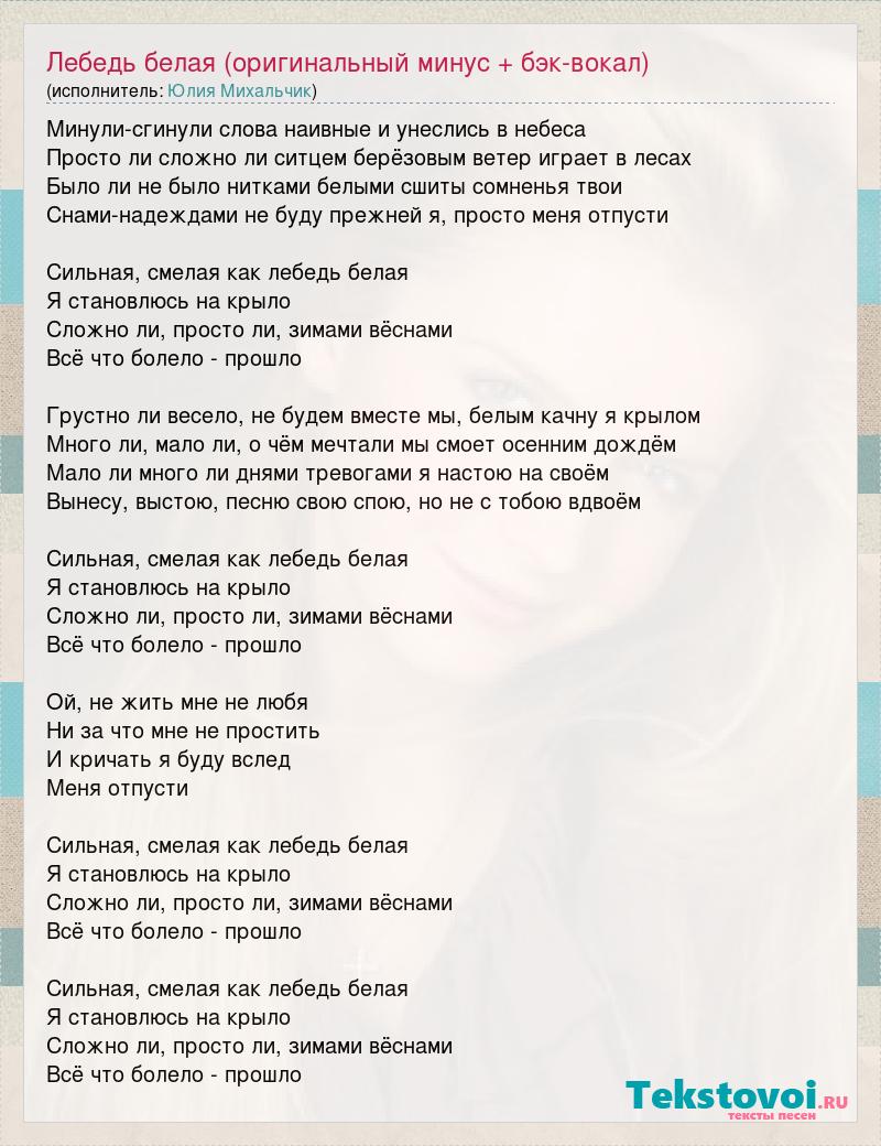Минули-сгинули слова наивные и унеслись в небеса Просто ли сложно ли ситцем берёзовым ветер играет в лесах Было ли не было нитками белыми сшиты сомненья твои Снами-надеждами не буду прежней я, просто меня отпусти Сильная, смелая как лебедь белая Я становлюсь на крыло Сложно ли, просто ли, зимами вёснами Всё что болело - прошло Грустно ли весело, не будем вместе мы, белым качну я крылом Много ли, мало ли, о чём мечтали мы смоет осенним дождём Мало ли много ли днями тревогами я настою на своём Вынесу, выстою, песню свою спою, но не с тобою вдвоём Сильная, смелая как лебедь белая Я становлюсь на крыло Сложно ли, просто ли, зимами вёснами Всё что болело - прошло Ой, не жить мне не любя Ни за что мне не простить И кричать я буду вслед Меня отпусти Сильная, смелая как лебедь белая Я становлюсь на крыло Сложно ли, просто ли, зимами вёснами Всё что болело - прошло Сильная, смелая как лебедь белая Я становлюсь на крыло Сложно ли, просто ли, зимами вёснами Всё что болело - прошло