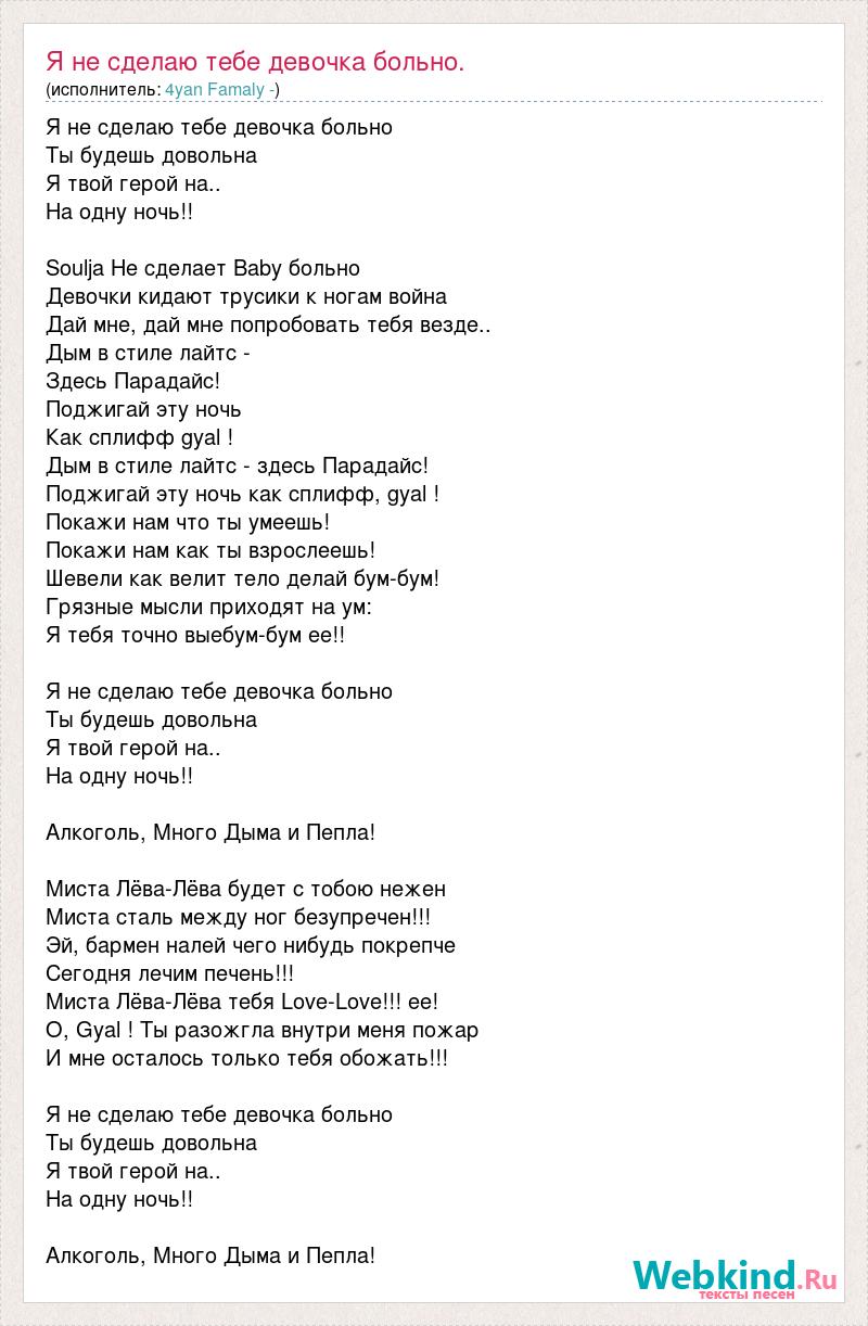 Я не сделаю тебе девочка больно Ты будешь довольна Я твой герой на.. На одну ночь!! Soulja Не сделает Baby больно Девочки кидают трусики к ногам война Дай мне, дай мне попробовать тебя везде.. Дым в стиле лайтс - Здесь Парадайс! Поджигай эту ночь Как сплифф gyal ! Дым в стиле лайтс - здесь Парадайс! Поджигай эту ночь как сплифф, gyal ! Покажи нам что ты умеешь! Покажи нам как ты взрослеешь! Шевели как велит тело делай бум-бум! Грязные мысли приходят на ум: Я тебя точно выебум-бум ее!! Я не сделаю тебе девочка больно Ты будешь довольна Я твой герой на.. На одну ночь!! Алкоголь, Много Дыма и Пепла! Миста Лёва-Лёва будет с тобою нежен Миста сталь между ног безупречен!!! Эй, бармен налей чего нибудь покрепче Сегодня лечим печень!!! Миста Лёва-Лёва тебя Love-Love!!! ее! O, Gyal ! Ты разожгла внутри меня пожар И мне осталось только тебя обожать!!! Я не сделаю тебе девочка больно Ты будешь довольна Я твой герой на.. На одну ночь!! Алкоголь, Много Дыма и Пепла!