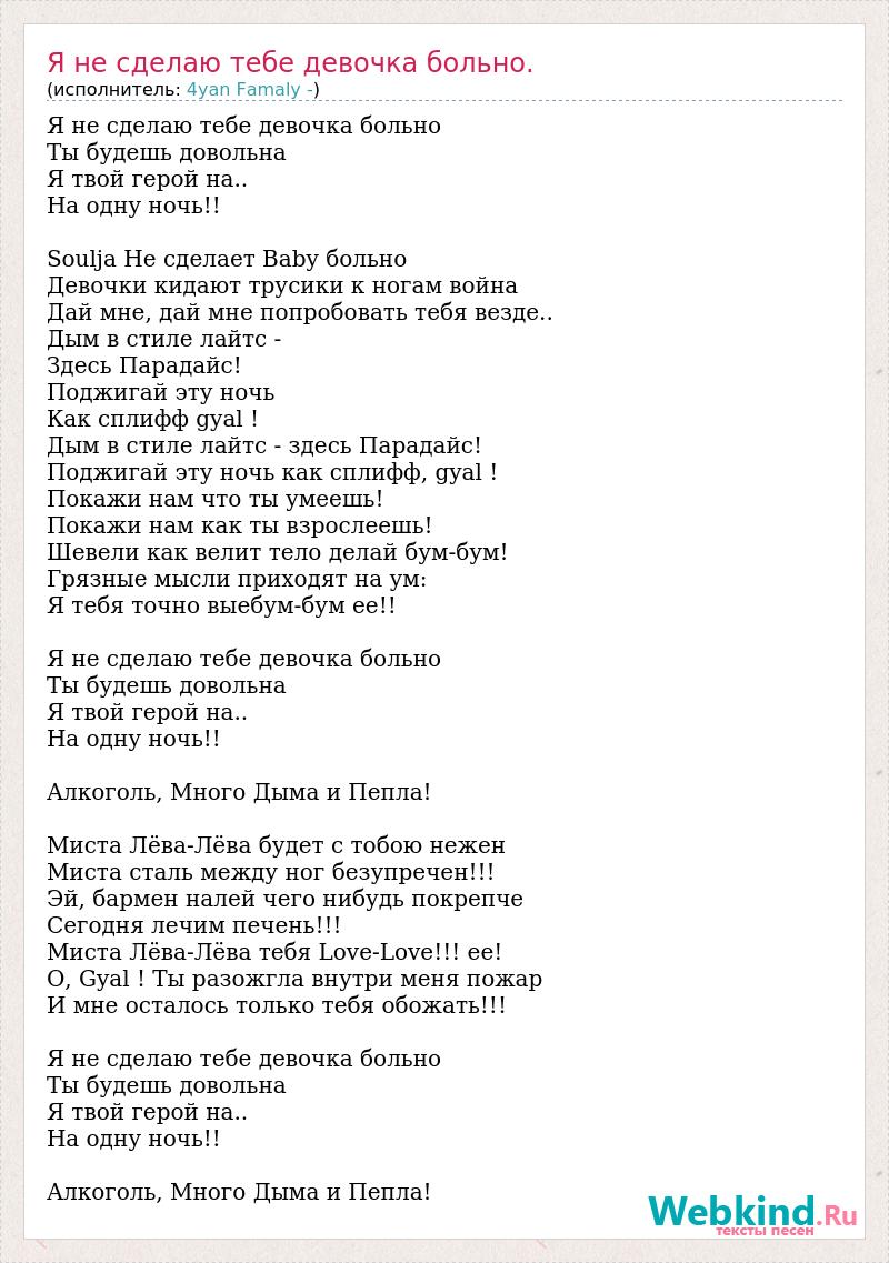 Я не сделаю тебе девочка больно Ты будешь довольна Я твой герой на.. На одну ночь!! Soulja Не сделает Baby больно Девочки кидают трусики к ногам война Дай мне, дай мне попробовать тебя везде.. Дым в стиле лайтс - Здесь Парадайс! Поджигай эту ночь Как сплифф gyal ! Дым в стиле лайтс - здесь Парадайс! Поджигай эту ночь как сплифф, gyal ! Покажи нам что ты умеешь! Покажи нам как ты взрослеешь! Шевели как велит тело делай бум-бум! Грязные мысли приходят на ум: Я тебя точно выебум-бум ее!! Я не сделаю тебе девочка больно Ты будешь довольна Я твой герой на.. На одну ночь!! Алкоголь, Много Дыма и Пепла! Миста Лёва-Лёва будет с тобою нежен Миста сталь между ног безупречен!!! Эй, бармен налей чего нибудь покрепче Сегодня лечим печень!!! Миста Лёва-Лёва тебя Love-Love!!! ее! O, Gyal ! Ты разожгла внутри меня пожар И мне осталось только тебя обожать!!! Я не сделаю тебе девочка больно Ты будешь довольна Я твой герой на.. На одну ночь!! Алкоголь, Много Дыма и Пепла!