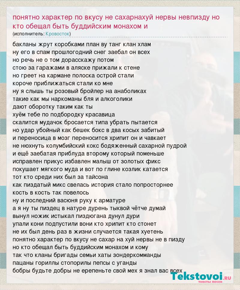 Главная→Исполнители→Кровосток→Понятно характер по вкусу не сахарнахуй нервы невпизду но кто обещал быть