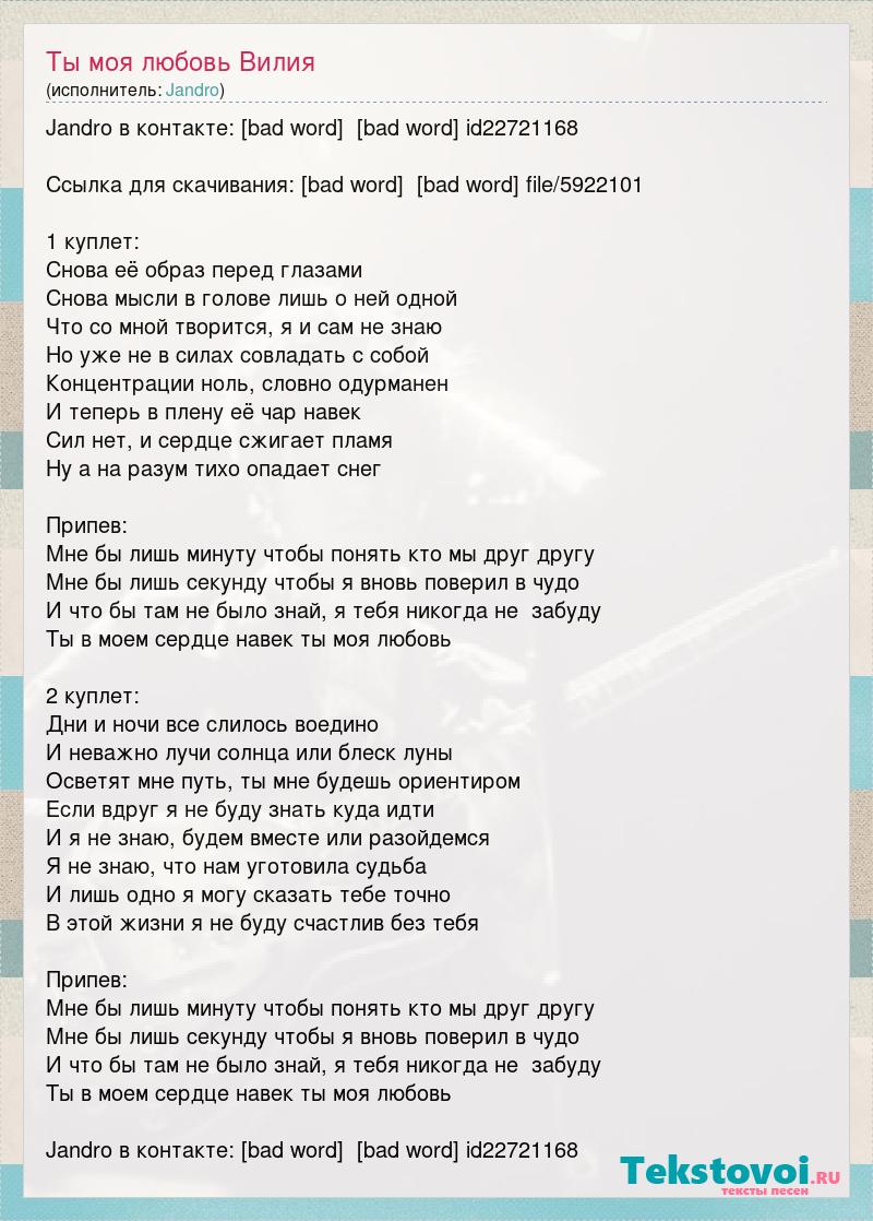 Jandro в контакте: [bad word] [bad word] id22721168 Ссылка для скачивания: [bad word] [bad word] file/5922101 1 куплет: Снова её образ перед глазами Снова мысли в голове лишь о ней одной Что со мной творится, я и сам не знаю Но уже не в силах совладать с собой Концентрации ноль, словно одурманен И теперь в плену её чар навек Сил нет, и сердце сжигает пламя Ну а на разум тихо опадает снег Припев: Мне бы лишь минуту чтобы понять кто мы друг другу Мне бы лишь секунду чтобы я вновь поверил в чудо И что бы там не было знай, я тебя никогда не забуду Ты в моем сердце навек ты моя любовь 2 куплет: Дни и ночи все слилось воедино И неважно лучи солнца или блеск луны Осветят мне путь, ты мне будешь ориентиром Если вдруг я не буду знать куда идти И я не знаю, будем вместе или разойдемся Я не знаю, что нам уготовила судьба И лишь одно я могу сказать тебе точно В этой жизни я не буду счастлив без тебя Припев: Мне бы лишь минуту чтобы понять кто мы друг другу Мне бы лишь секунду чтобы я вновь поверил в чудо И что бы там не было знай, я тебя никогда не забуду Ты в моем сердце навек ты моя любовь Jandro в контакте: [bad word] [bad word] id22721168