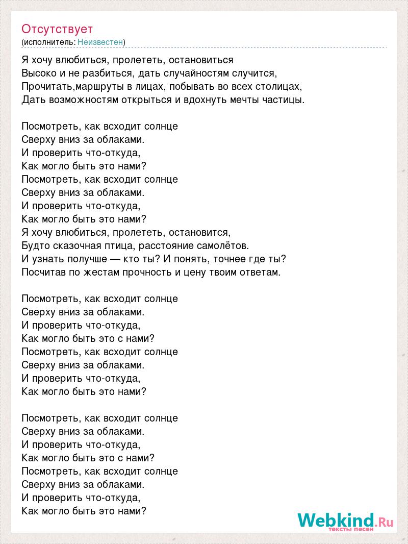Я хочу влюбиться, пролететь, остановиться Высоко и не разбиться, дать случайностям случится, Прочитать,маршруты в лицах, побывать во всех столицах, Дать возможностям открыться и вдохнуть мечты частицы. Посмотреть, как всходит солнце Сверху вниз за облаками. И проверить что-откуда, Как могло быть это нами? Посмотреть, как всходит солнце Сверху вниз за облаками. И проверить что-откуда, Как могло быть это нами? Я хочу влюбиться, пролететь, остановится, Будто сказочная птица, расстояние самолётов. И узнать получше — кто ты? И понять, точнее где ты? Посчитав по жестам прочность и цену твоим ответам. Посмотреть, как всходит солнце Сверху вниз за облаками. И проверить что-откуда, Как могло быть это с нами? Посмотреть, как всходит солнце Сверху вниз за облаками. И проверить что-откуда, Как могло быть это нами? Посмотреть, как всходит солнце Сверху вниз за облаками. И проверить что-откуда, Как могло быть это с нами? Посмотреть, как всходит солнце Сверху вниз за облаками. И проверить что-откуда, Как могло быть это нами?