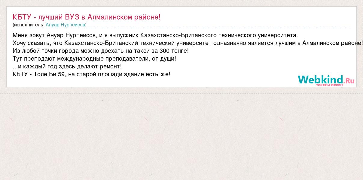 А как ты думаешь, о чем песня "КБТУ - лучший ВУЗ в Алмалинском районе!" ?