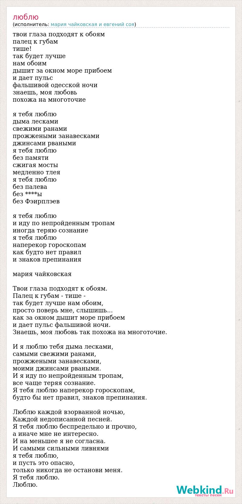 твои глаза подходят к обоям палец к губам тише! так будет лучше нам обоим дышит за окном море прибоем и дает пульс фальшивой одесской ночи знаешь, моя любовь похожа на многоточие я тебя люблю дыма лесками свежими ранами прожжеными занавесками джинсами рваными я тебя люблю без памяти сжигая мосты медленно тлея я тебя люблю без палева без ****ы без Фэирплэев я тебя люблю и иду по непройденным тропам иногда теряю сознание я тебя люблю наперекор гороскопам как будто нет правил и знаков препинания мария чайковская Твои глаза подходят к обоям. Палец к губам - тише - так будет лучше нам обоим, просто поверь мне, слышишь... как за окном дышит море прибоем и дает пульс фальшивой ночи. Знаешь, моя любовь так похожа на многоточие. И я люблю тебя дыма лесками, самыми свежими ранами, прожжеными занавесками, моими джинсами рваными. И я иду по непройденным тропам, все чаще теряя сознание. Я тебя люблю наперекор гороскопам, будто бы нет правил, знаков препинания. Люблю каждой взорванной ночью, Каждой недописанной песней. Я тебя люблю беспредельно и прочно, а иначе мне не интересно. И на меньшее я не согласна. И самыми сильными ливнями я тебя люблю, и пусть это опасно, только никогда не останови меня. Я тебя люблю. Люблю.