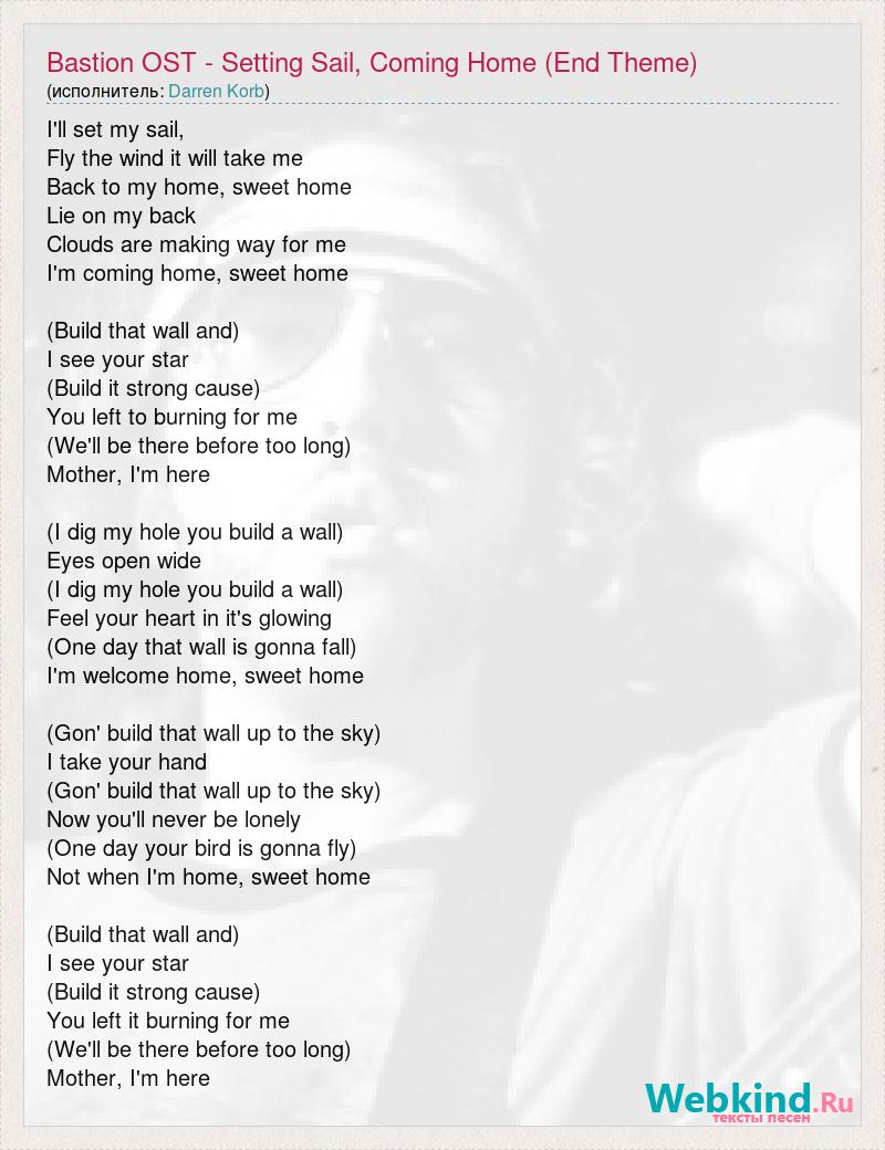 I'll set my sail, Fly the wind it will take me Back to my home, sweet home Lie on my back Clouds are making way for me I'm coming home, sweet home (Build that wall and) I see your star (Build it strong cause) You left to burning for me (We'll be there before too long) Mother, I'm here (I dig my hole you build a wall) Eyes open wide (I dig my hole you build a wall) Feel your heart in it's glowing (One day that wall is gonna fall) I'm welcome home, sweet home (Gon' build that wall up to the sky) I take your hand (Gon' build that wall up to the sky) Now you'll never be lonely (One day your bird is gonna fly) Not when I'm home, sweet home (Build that wall and) I see your star (Build it strong cause) You left it burning for me (We'll be there before too long) Mother, I'm here