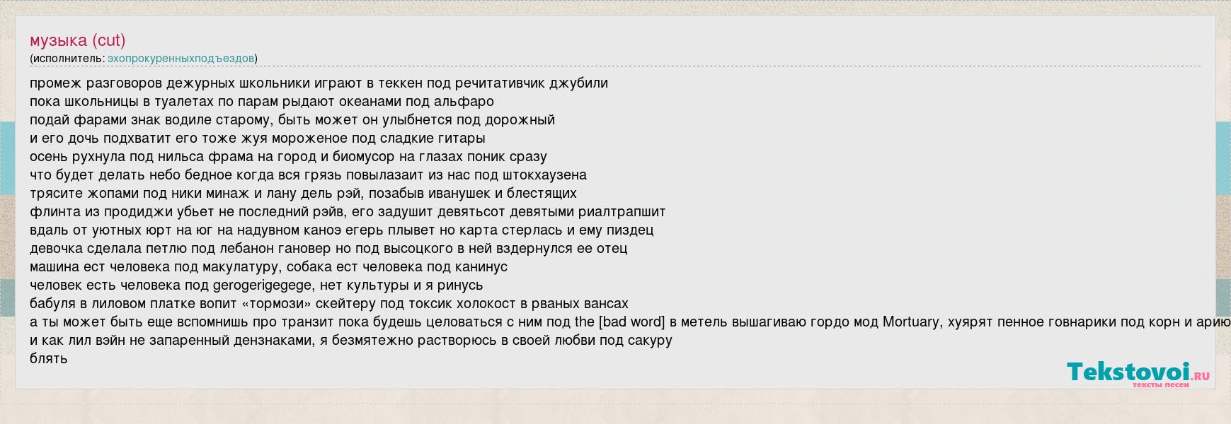 промеж разговоров дежурных школьники играют в теккен под речитативчик джубили пока школьницы в туалетах по парам рыдают океанами под альфаро подай фарами знак водиле старому, быть может он улыбнется под дорожный и его дочь подхватит его тоже жуя мороженое под сладкие гитары осень рухнула под нильса фрама на город и биомусор на глазах поник сразу что будет делать небо бедное когда вся грязь повылазаит из нас под штокхаузена трясите жопами под ники минаж и лану дель рэй, позабыв иванушек и блестящих флинта из продиджи убьет не последний рэйв, его задушит девятьсот девятыми риалтрапшит вдаль от уютных юрт на юг на надувном каноэ егерь плывет но карта стерлась и ему пиздец девочка сделала петлю под лебанон гановер но под высоцкого в ней вздернулся ее отец машина ест человека под макулатуру, собака ест человека под канинус человек есть человека под gerogerigegege, нет культуры и я ринусь бабуля в лиловом платке вопит «тормози» скейтеру под токсик холокост в рваных вансах а ты может быть еще вспомнишь про транзит пока будешь целоваться с ним под the drums в метель вышагиваю гордо мод Mortuary, хуярят пенное говнарики под корн и арию и как лил вэйн не запаренный дензнаками, я безмятежно растворюсь в своей любви под сакуру блять
